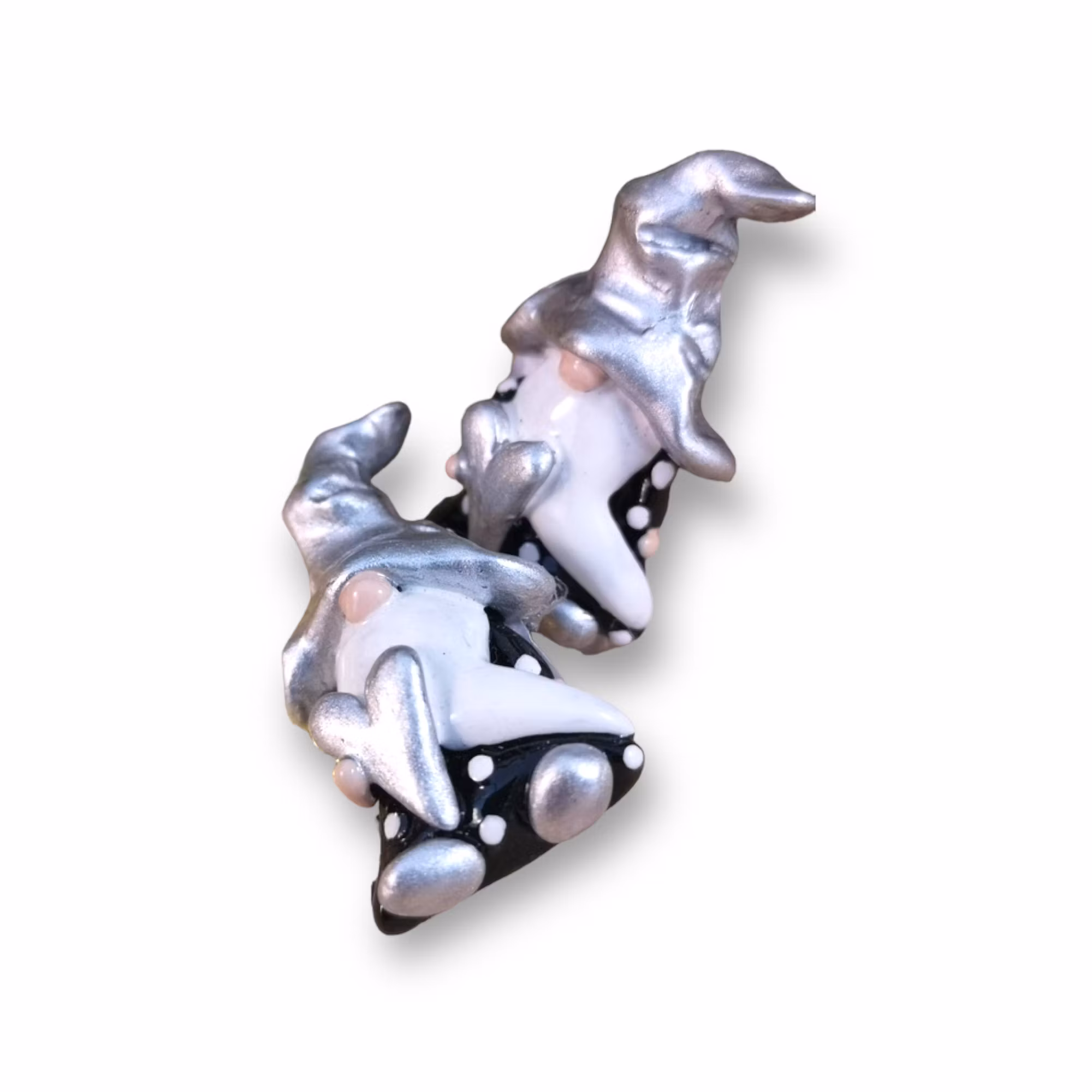Liten tomte med silverfärgad luva som brosch.EGEN DESIGNStl ca: 4 x 2 cmPris: 45:-