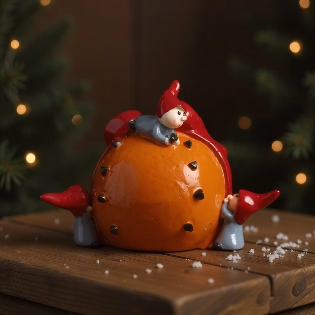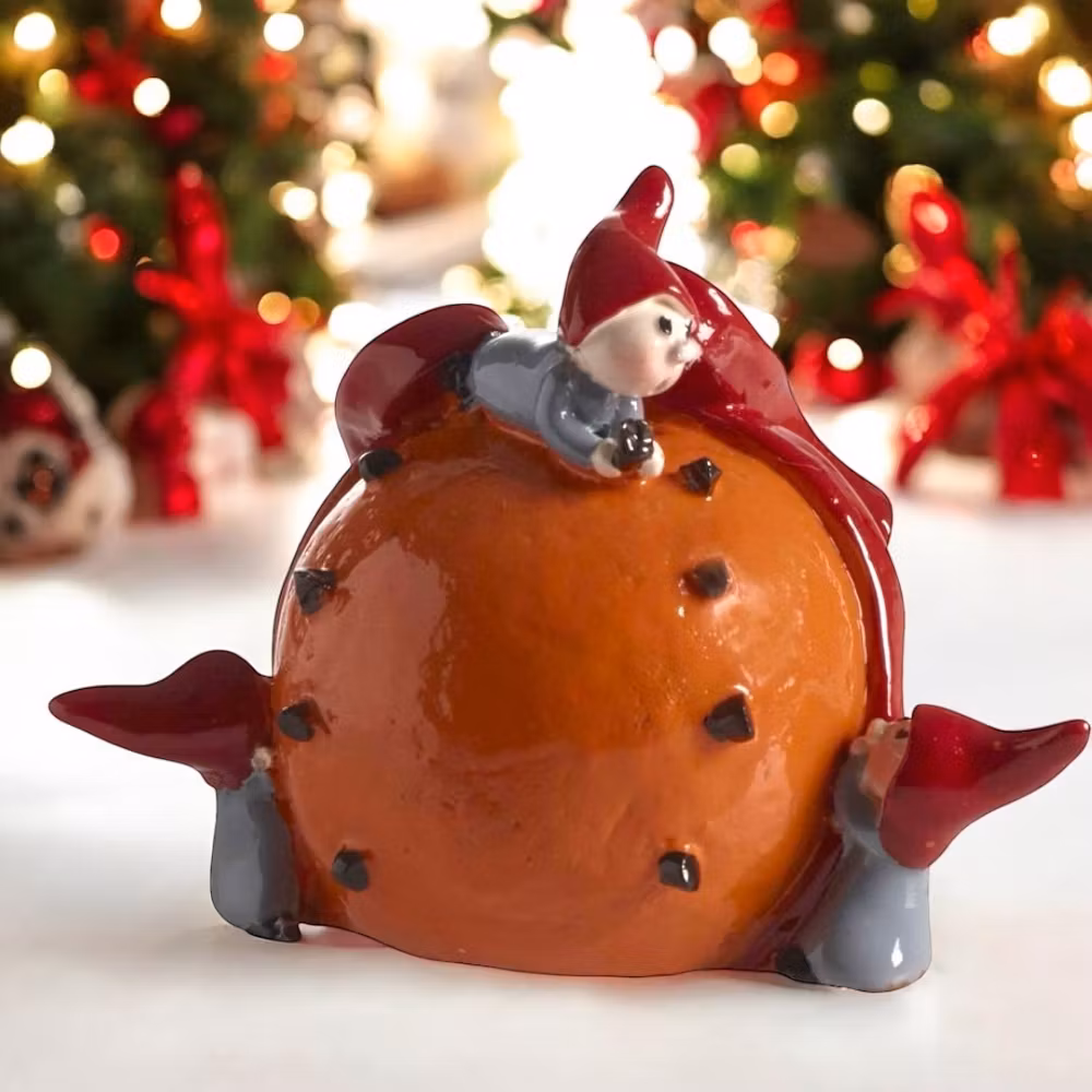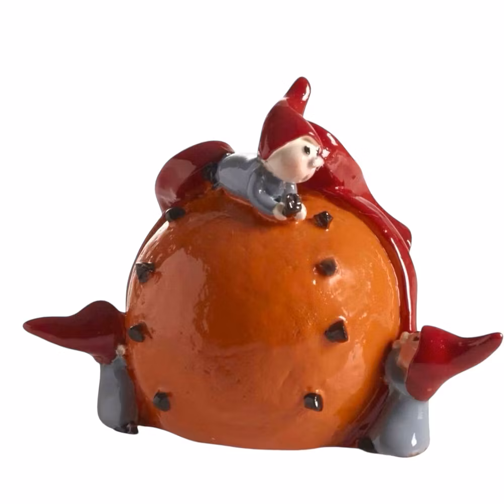 Julfigur med tre små nissar som pyntar en clementin med kryddnejlikor och rött band. Originaldesign för Nääsgränsgården, levereras i presentförpackning med prod