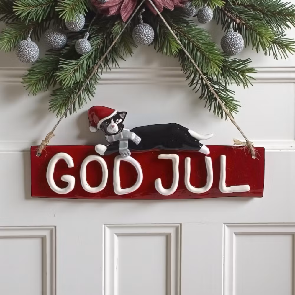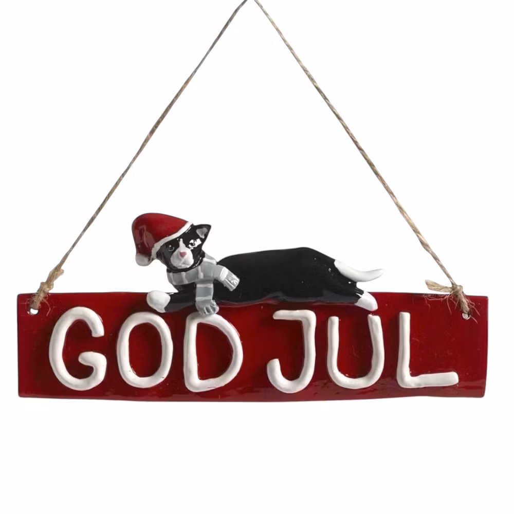 Röd och vit "God Jul"-skylt med katten Dolly som vilar på överkanten. Hängs upp med jutesnöre och passar både inne och ute – originaldesign för Nääsgränsgården.