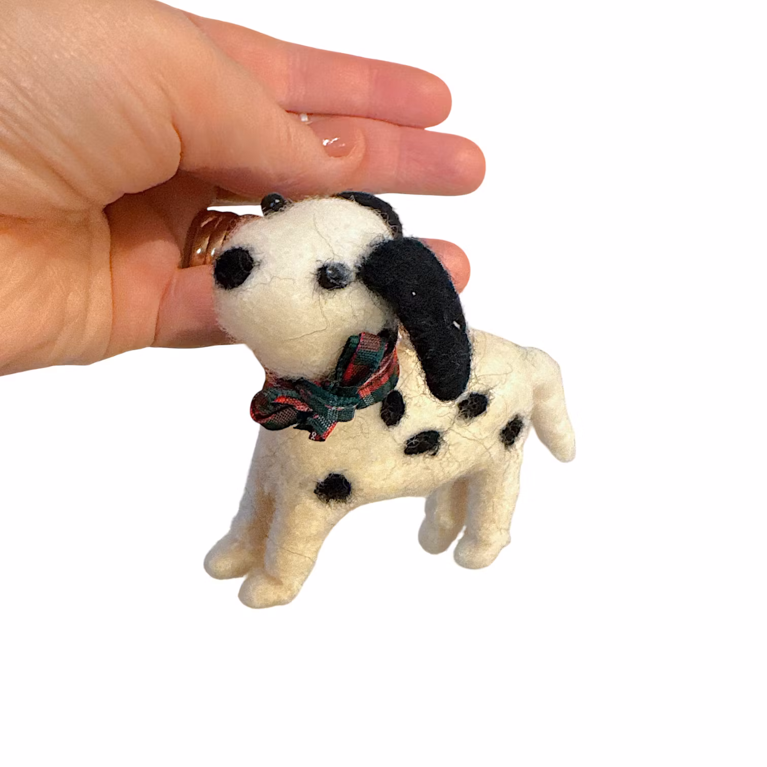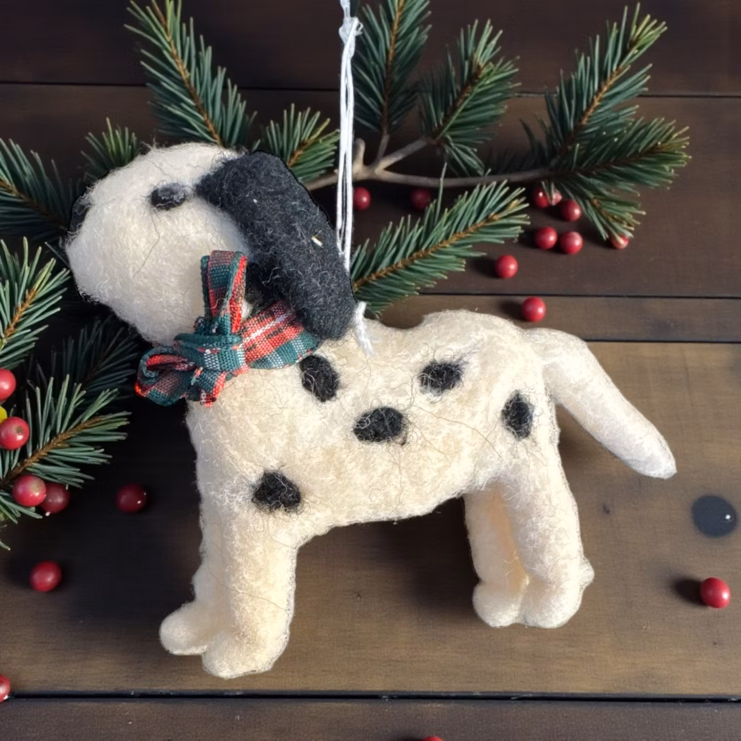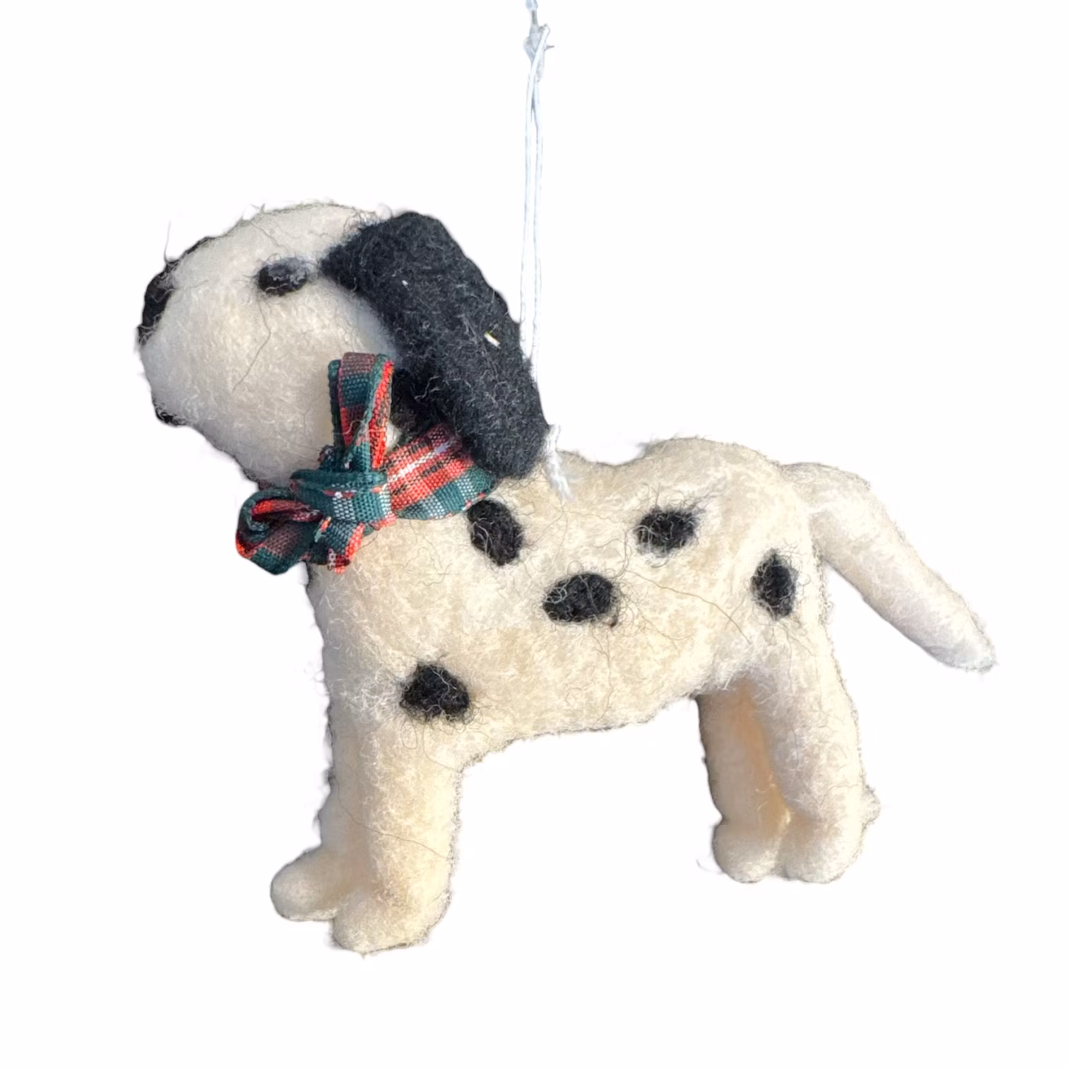 En filtad hund som sprider både värme och lekfullhet i julpyntet! Med sin vita kropp, svarta prickar och klassiska rutiga halsduk är den en dekorativ detalj som passar perfekt att hänga i granen, på en krok eller som en del av en personlig juldekoration. Den blir snabbt en favorit bland både barn och vuxna och är ett fint presenttips för hundälskare eller för den som vill addera en handgjord känsla till sitt julhem.