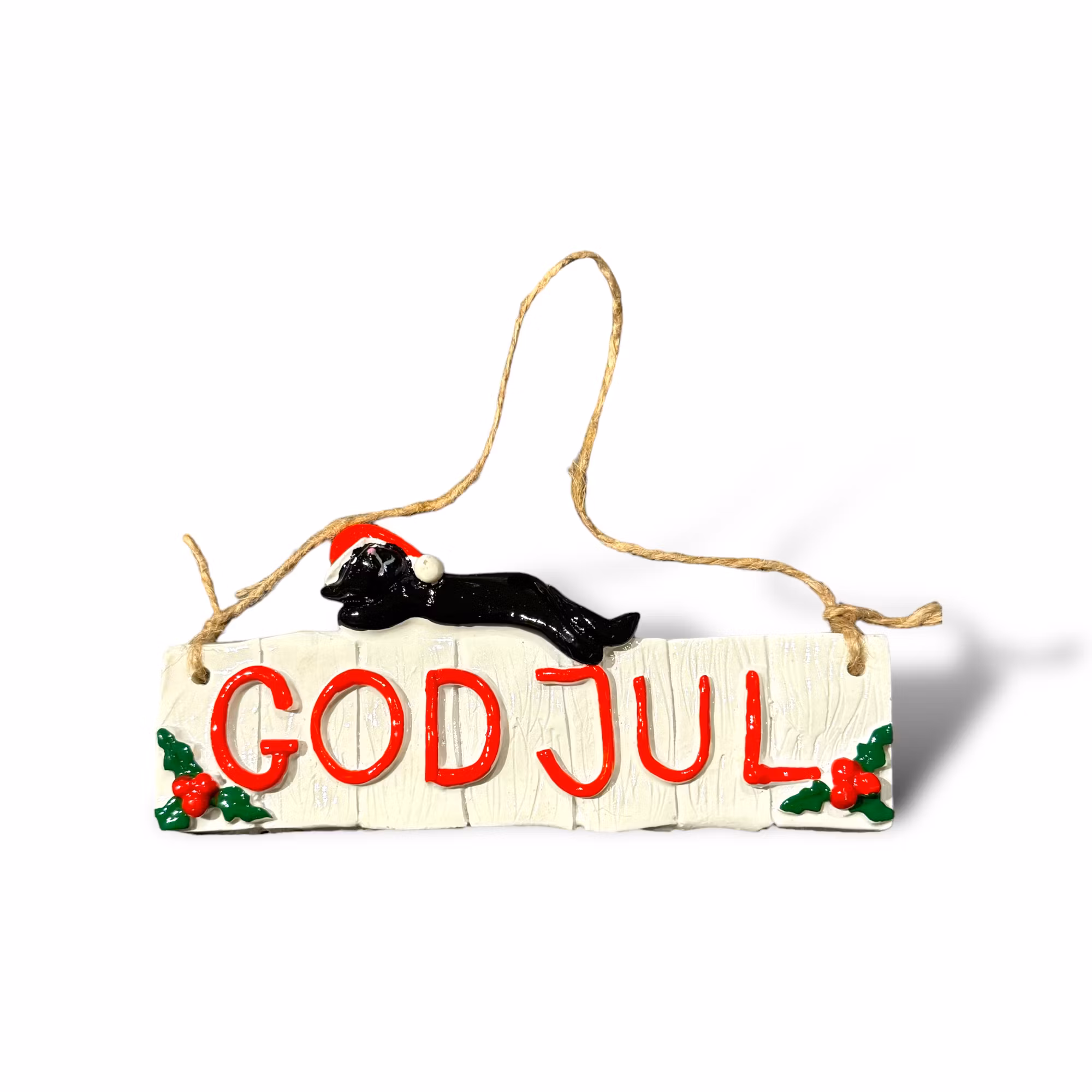 GOD JUL-skylt att hänga. Passar lika bra ute som inne.EGEN DESIGNStl: 15 x 6,5 cmPris: 89:-