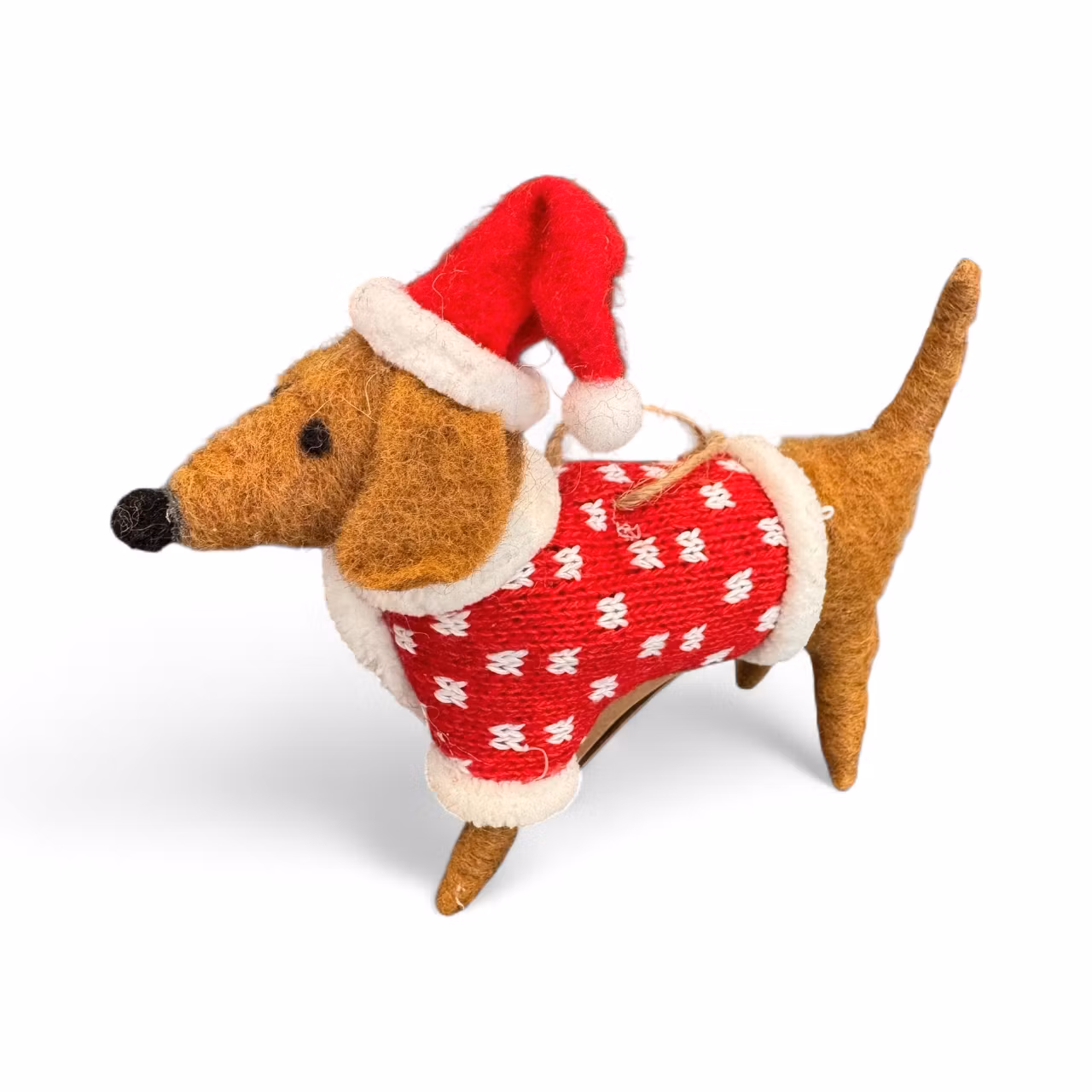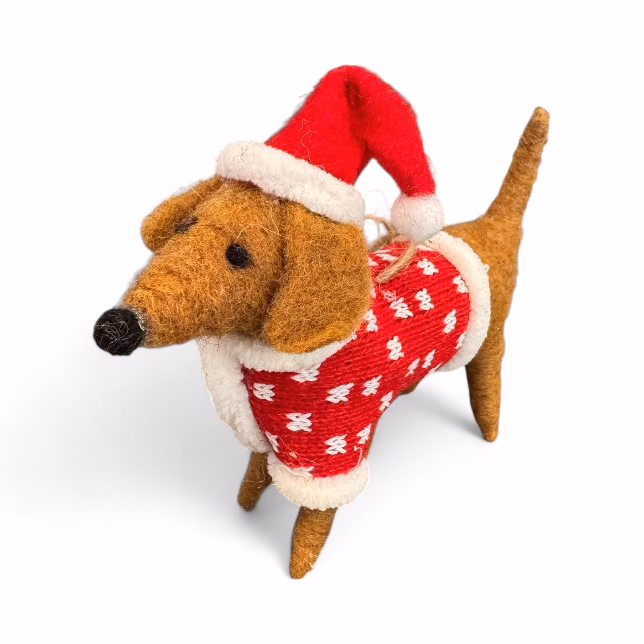 En färgglad tax i filt med stickad röd tröja med vita prickar och tomteluva på huvudet. Kan både hängas i granen eller ställas som dekoration.