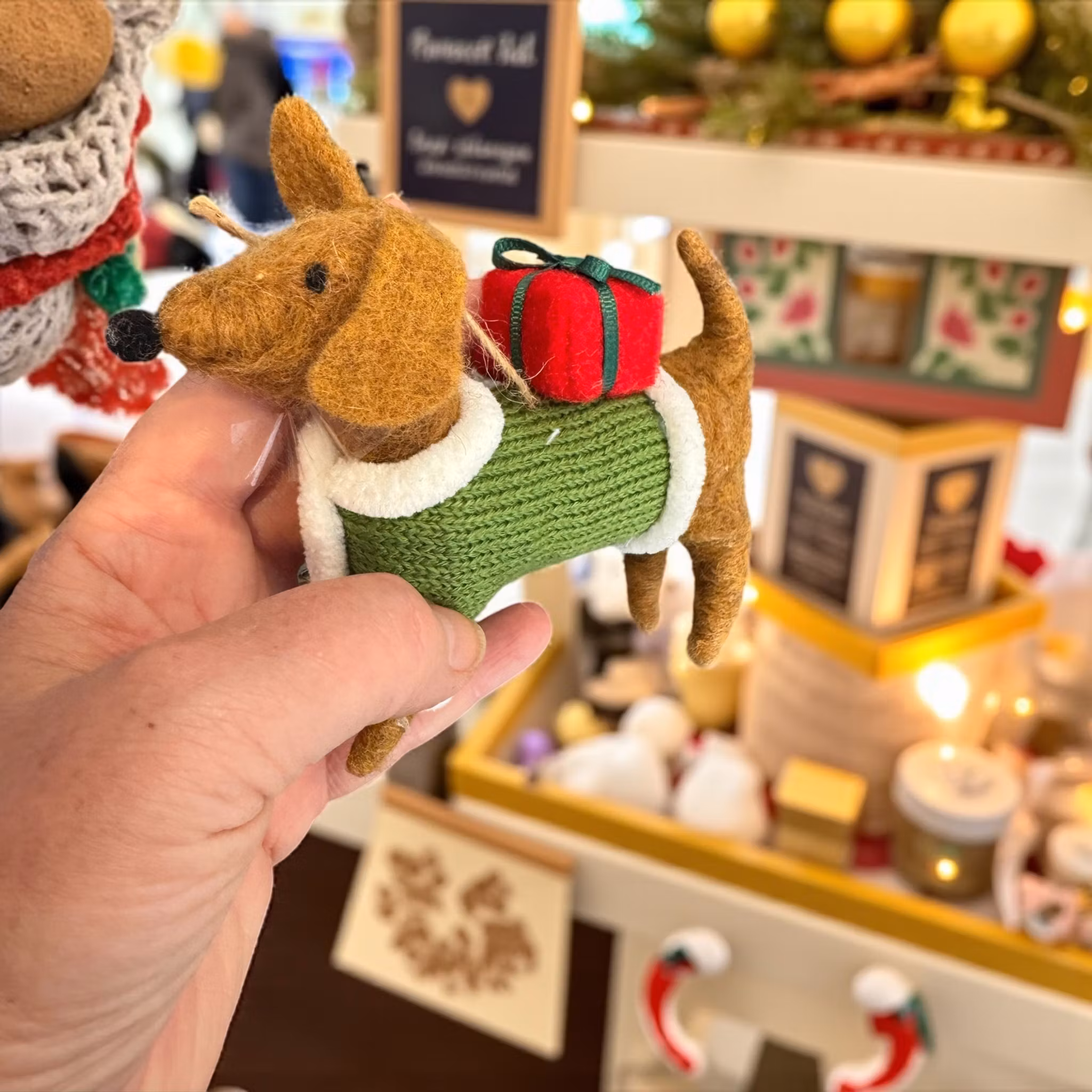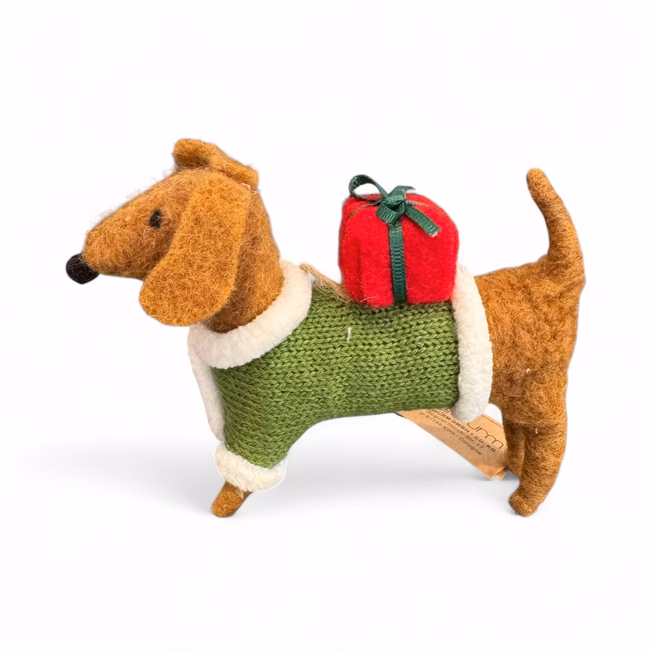 En färgglad tax i filt med grön tröja och ett rött paket på ryggen – redo för julens uppdrag. Kan både hängas i granen eller ställas som dekoration.