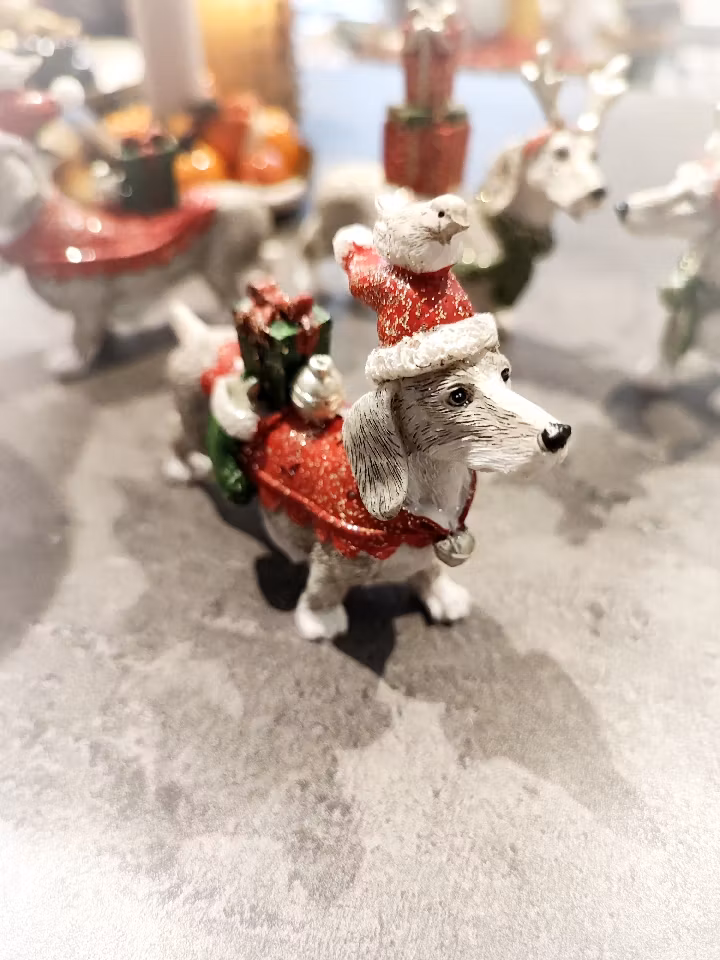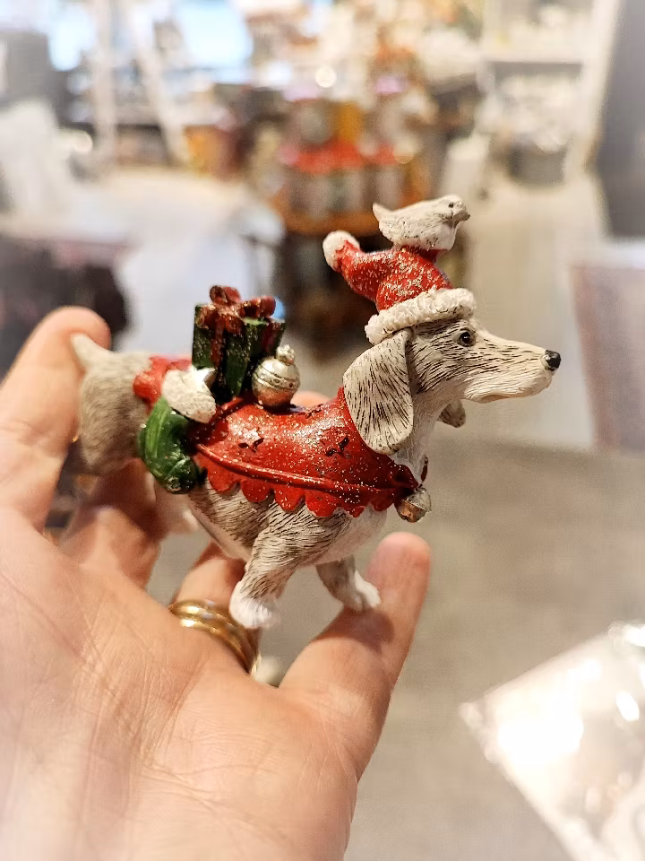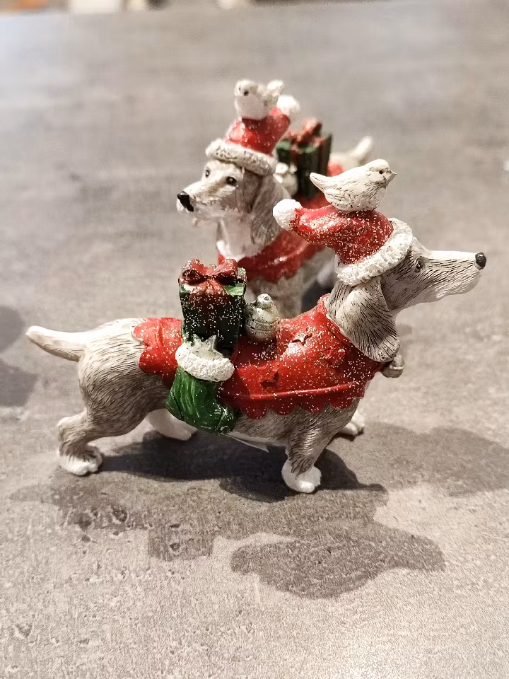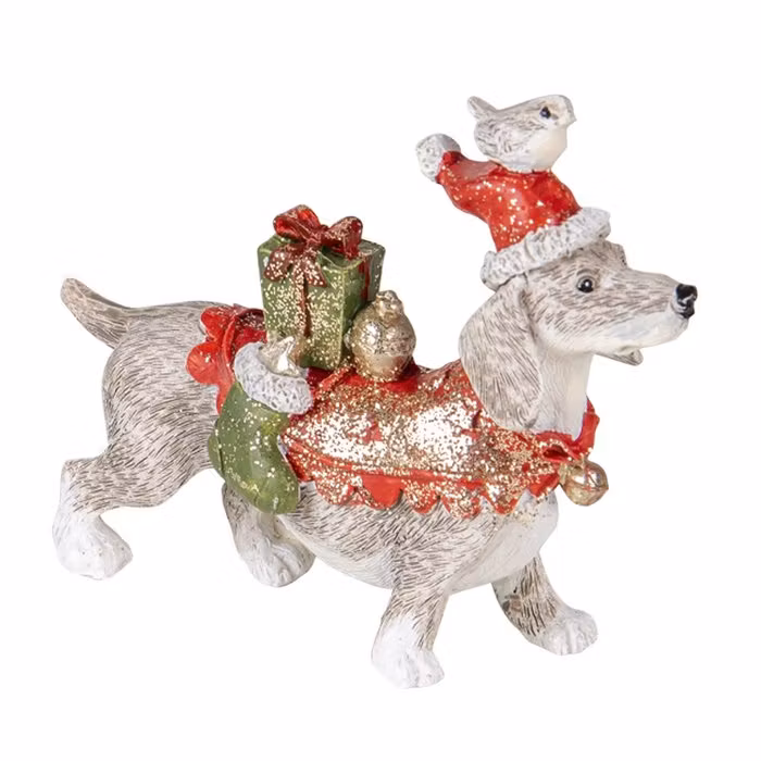 Söt liten tax men tomteluva och liten fågel på huvudet och julklapp mm på ryggen. Stl: 9,5 x 8 cmPris: 98:-