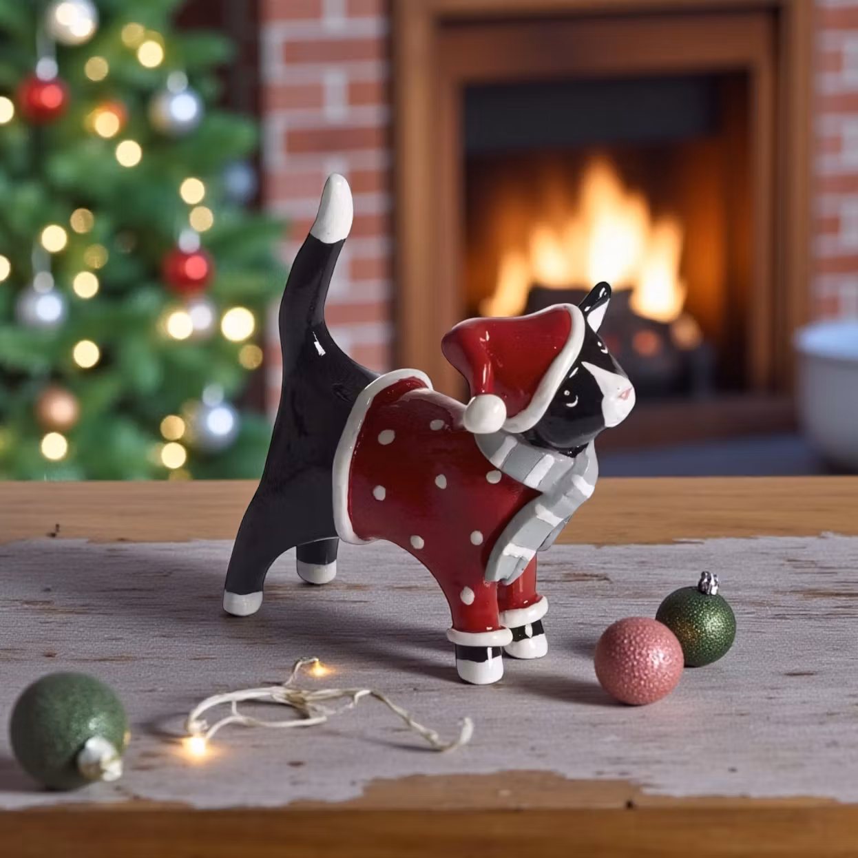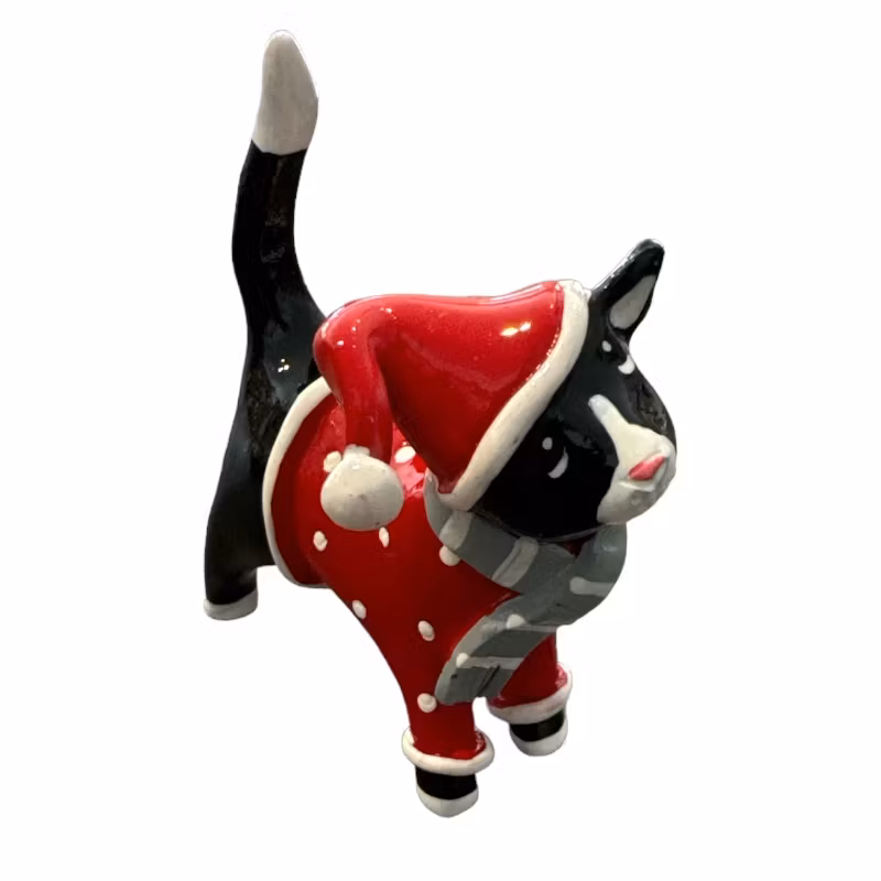 Dolly har klätt upp sig för julen – med röd tomteluva, röd tröja med vita prickar och en halsduk som matchar vintervädret. Hon är liten, lagom och alldeles bedårande – en perfekt dekoration för advent, julbord eller som gåva till någon som älskar katter.