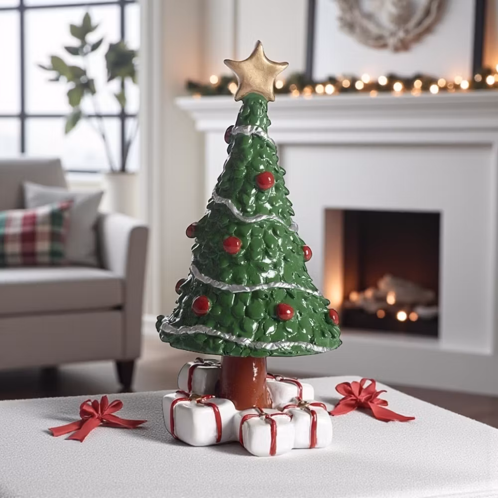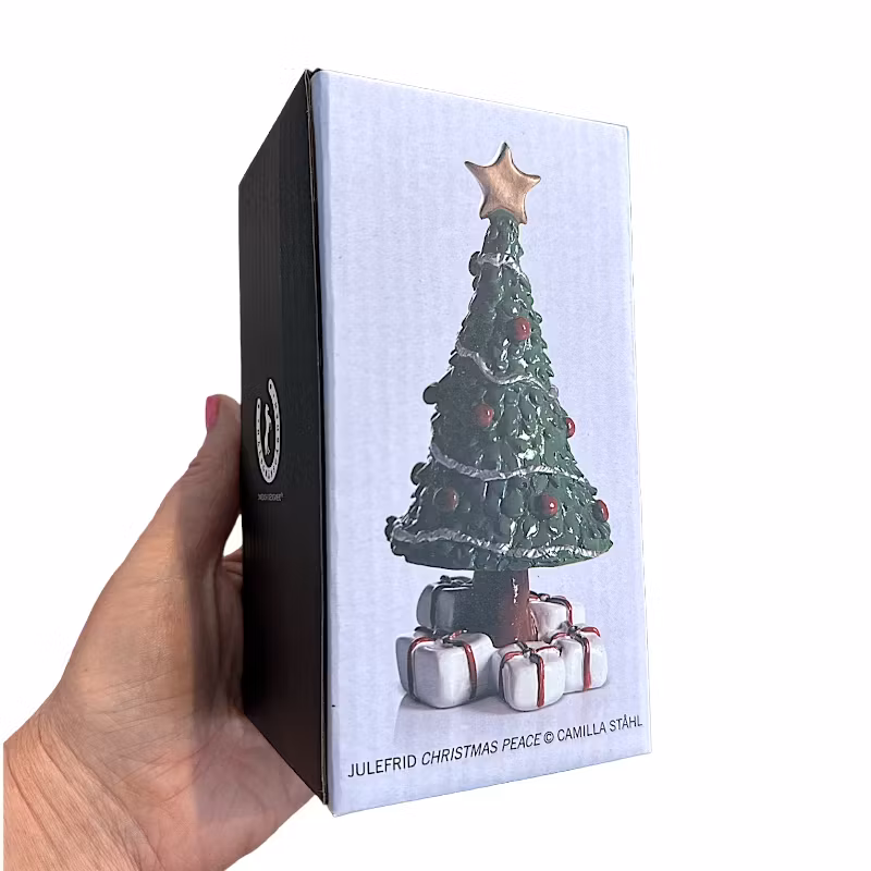 En juldekoration med själ och humor – denna lilla julgran står inte helt rak, utan lutar charmigt åt ena hållet, precis som granen där hemma som aldrig riktigt vill stå still. Under granen ligger små julklappar, och tack vare en fjäder undertill gungar den lätt när du rör vid den – som om den dansar in julen.