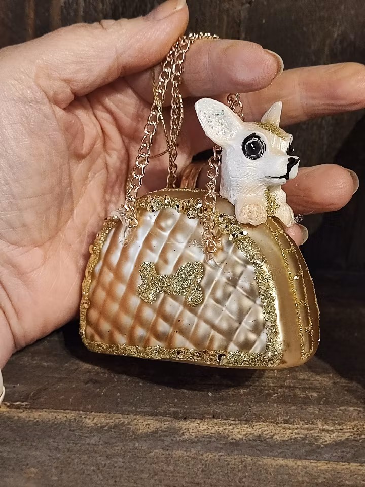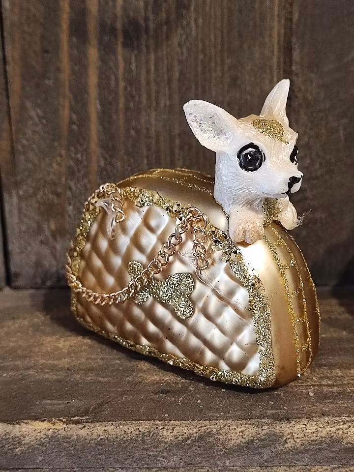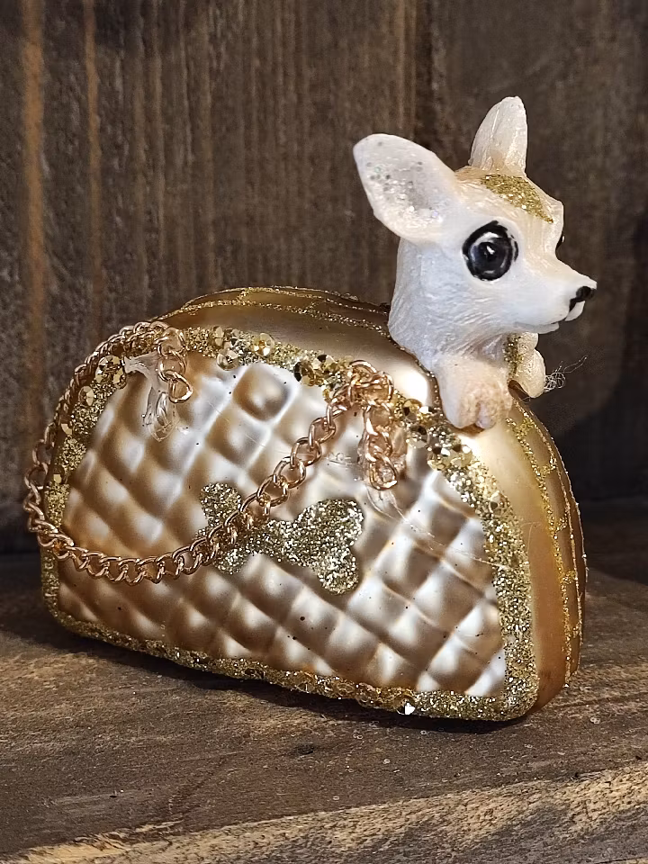 En liten chihuahua som sitter så fint i en lyxig väska. Kommer pryda vilken julgran som helst!