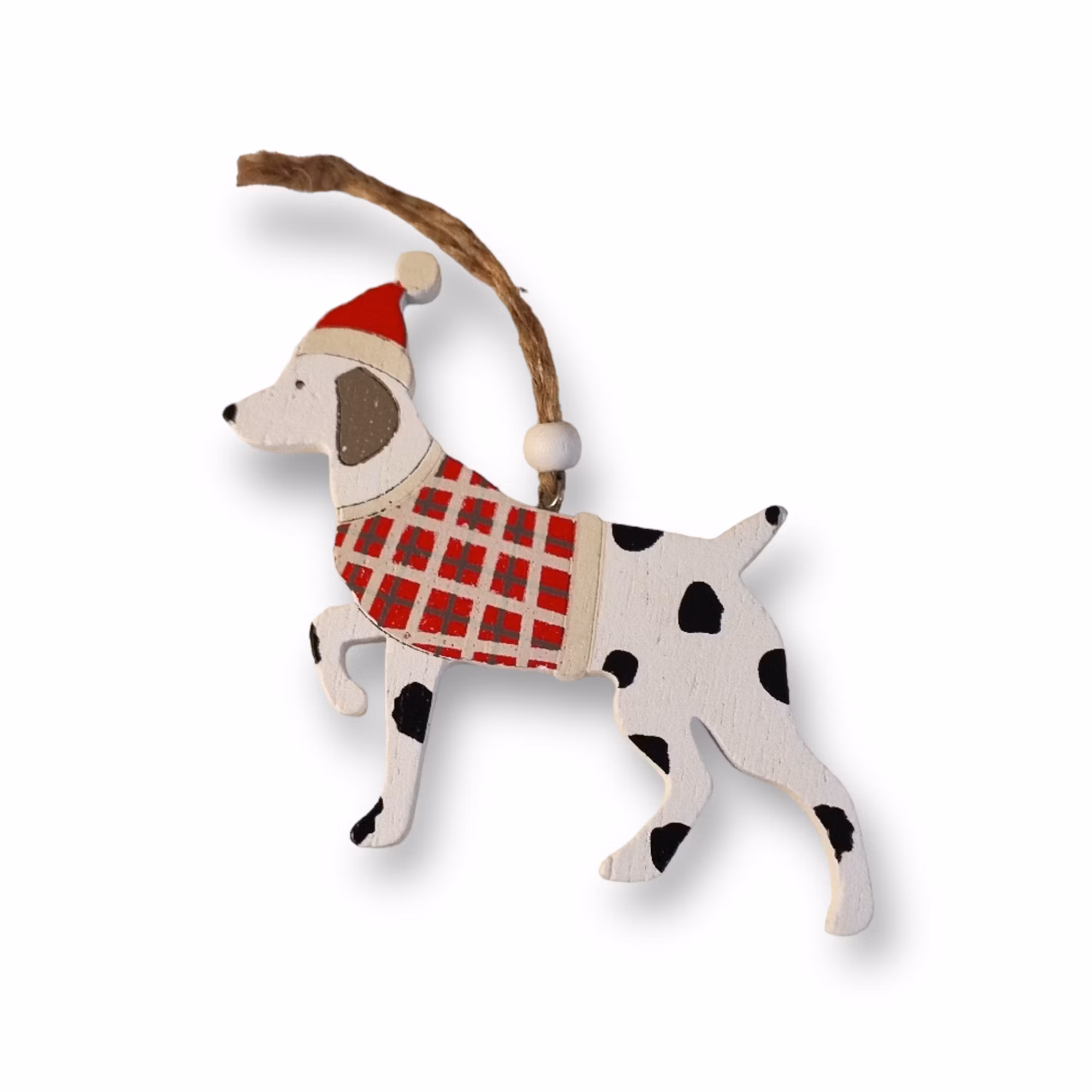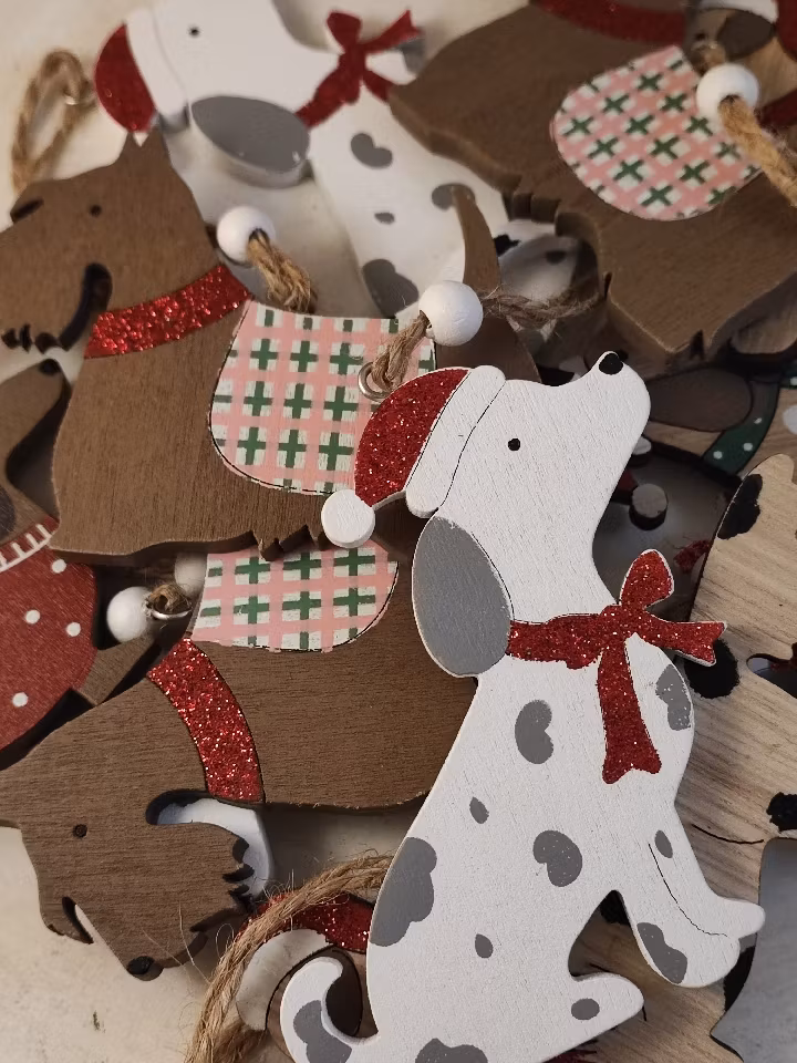 Hund i trä med juteband att hänga i julgranen.Stl ca: 4 x 7 cmPris: 45:-