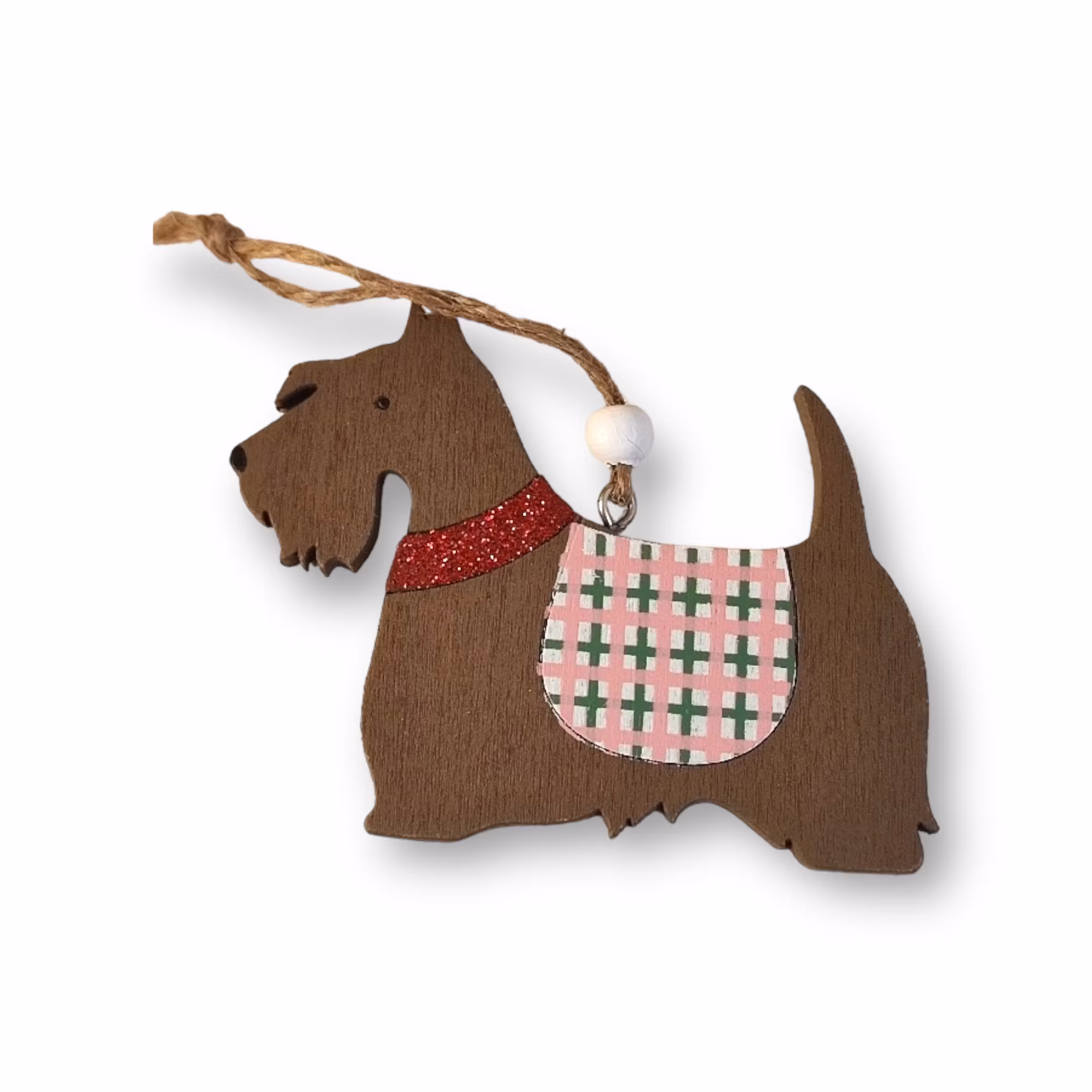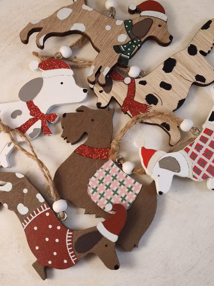 Hund i trä med juteband att hänga i julgranen.Stl ca: 4 x 7 cmPris: 45:-
