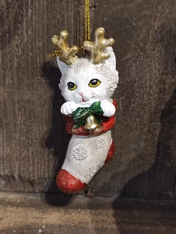 Söt liten katt i julstrumpa till att hänga i granen.Tillverkad i polyresin.