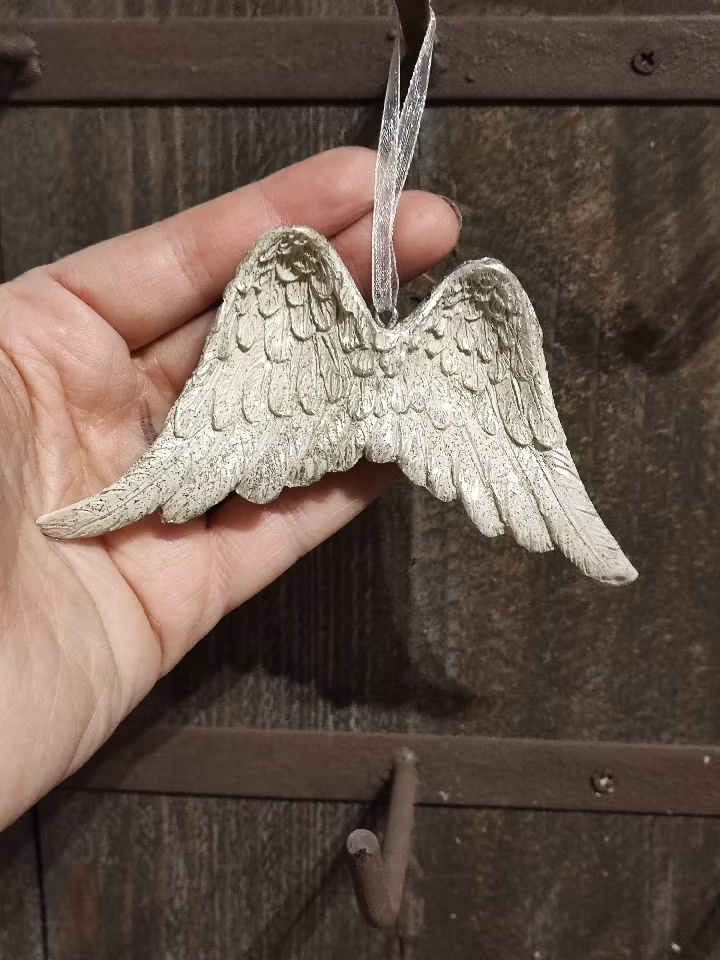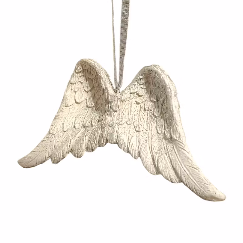 En liten ängelvinge som dekoration till julgranen, vinflaskan osv.Tillverkad i polyresin med fint band för upphängning.Stl: 12 x 9 cmPris: 49:-