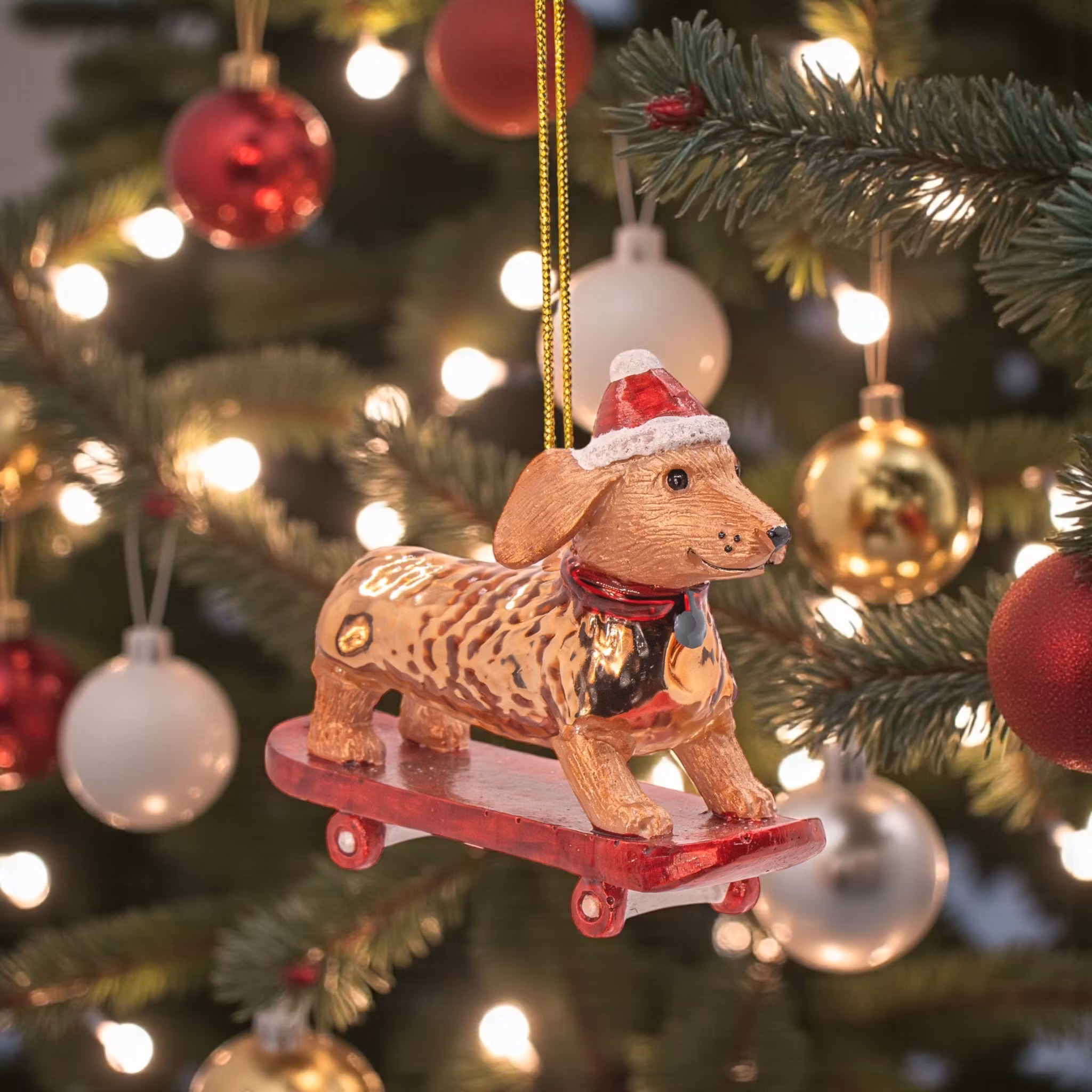 Den här julgransdekorationen är både lekfull och elegant – en tax som susar fram på skateboard med tomteluva på huvudet. Kroppen är tillverkad i kopparfärgat glas som ger en glittrande och festlig känsla, medan övriga delar är gjorda i polyresin för fina detaljer och hållbarhet. Figuren mäter ca 8,5 cm och blir en unik prydnad som sticker ut i granen och lockar till både leenden och samtal. Perfekt för hundälskare, samlare av ovanliga juldekorationer eller för den som vill addera en modern och humoristisk twist till julpyntet – en liten figur som sprider både glädje och julstämning.