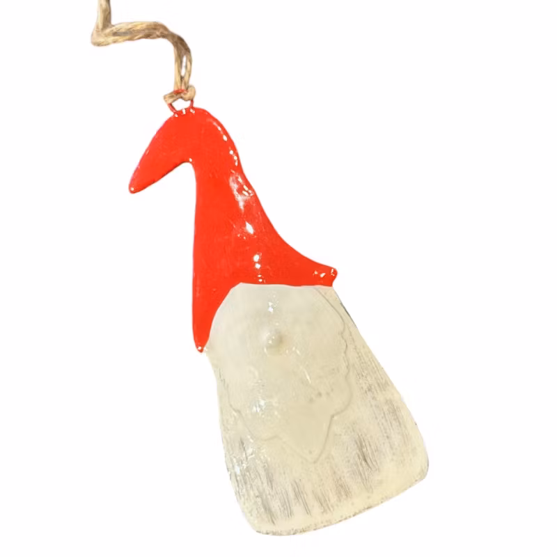 Tomte i plåt att hänga med vit kropp och röd luva.