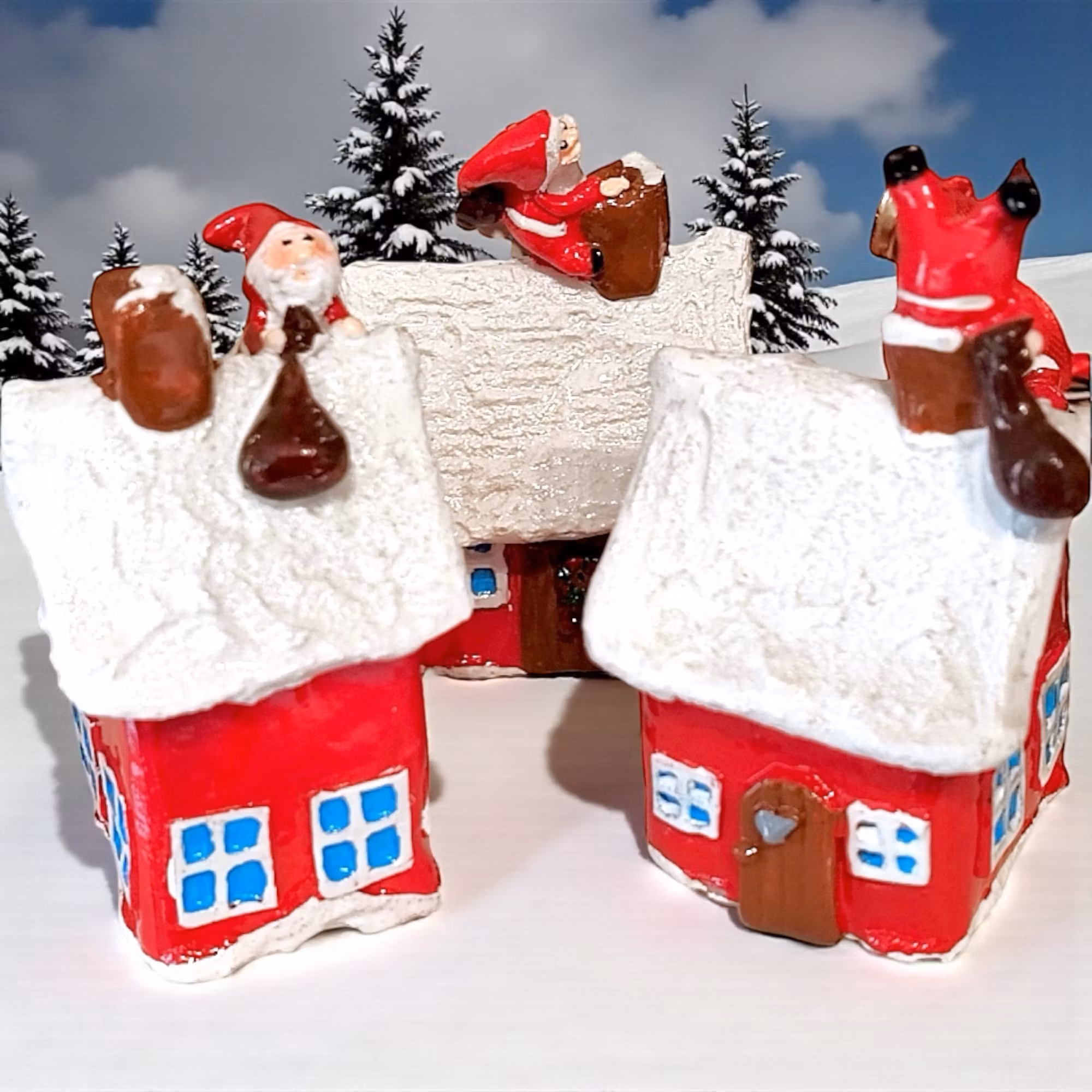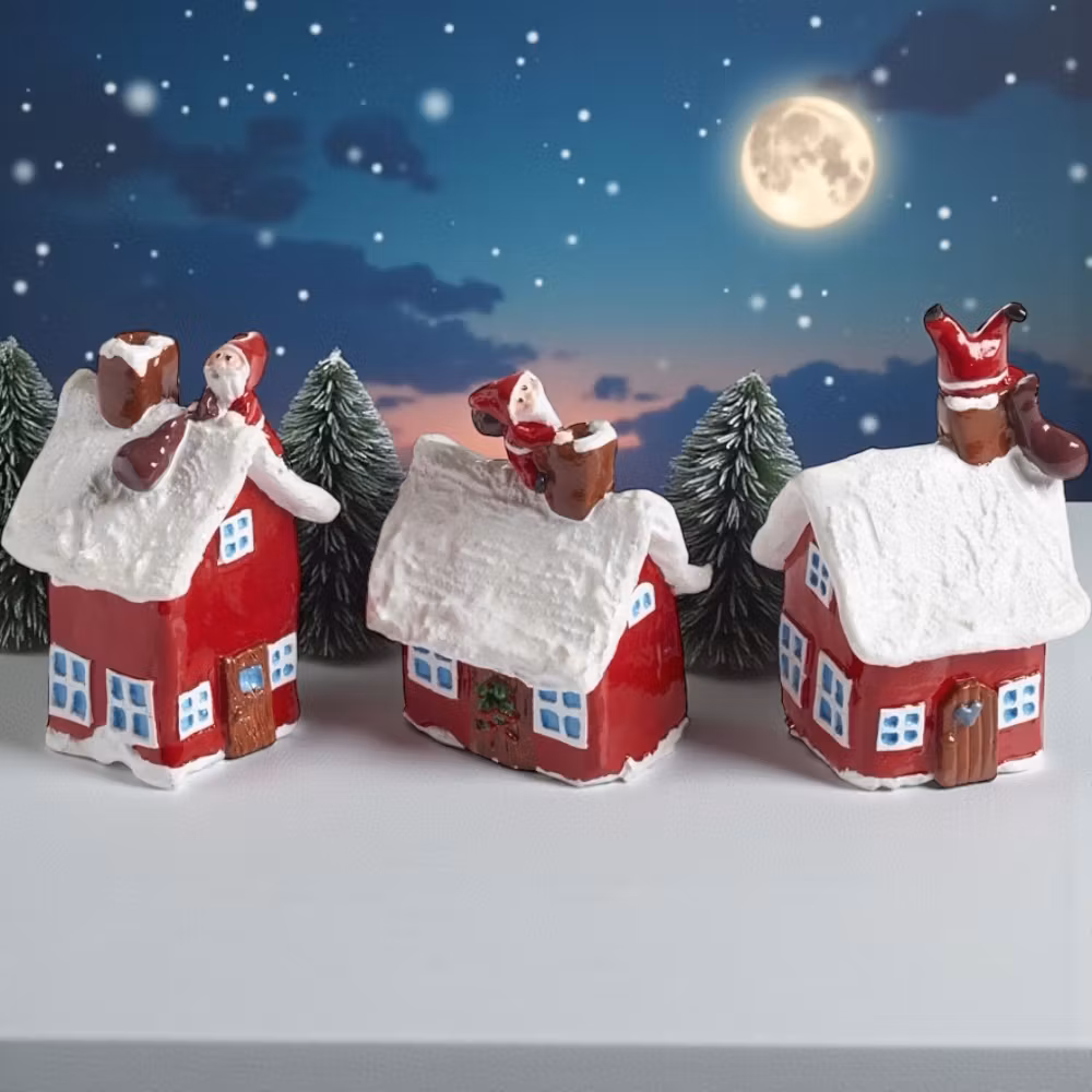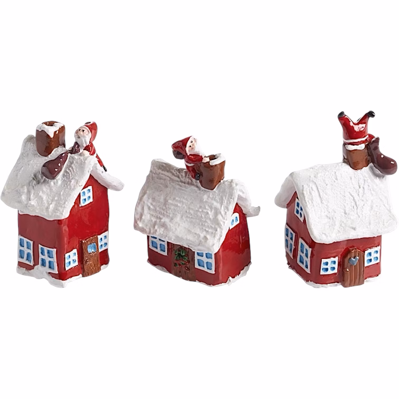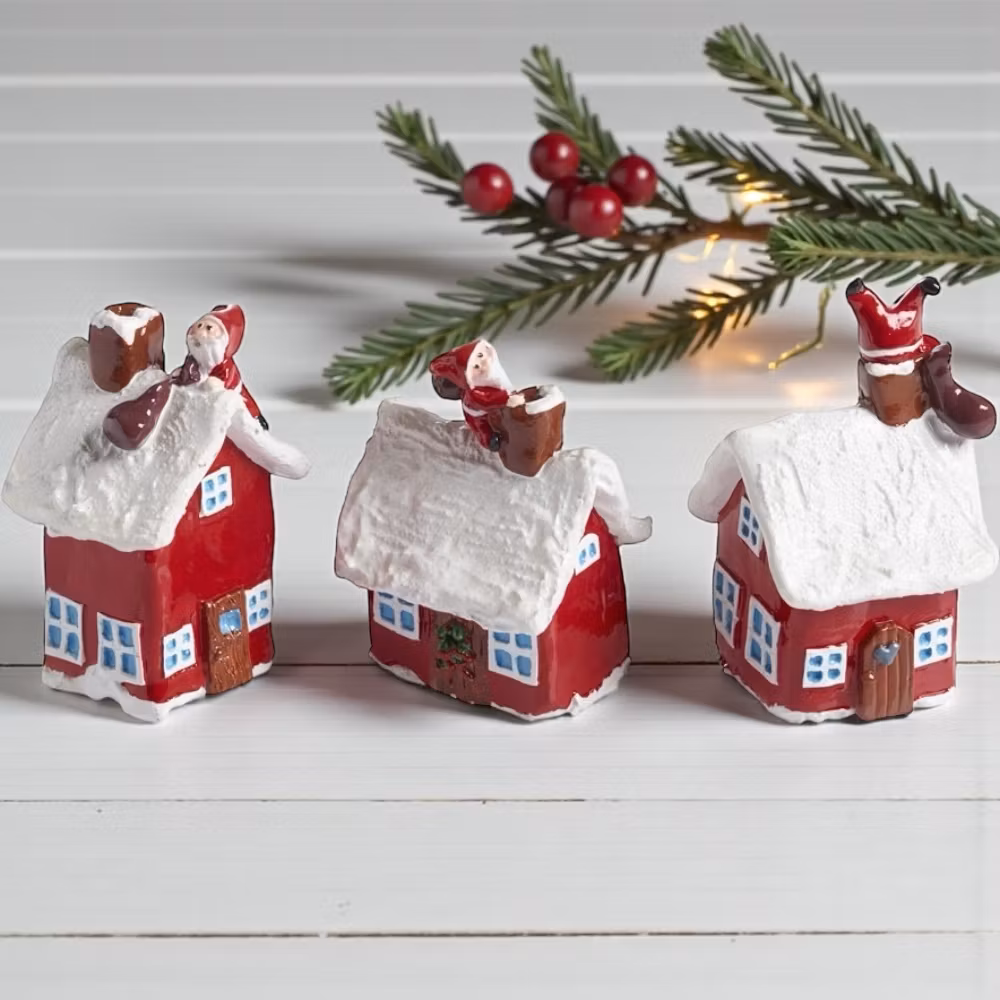 Tre små julhus med tomte som klättrar ner i skorstenen med sin säck. Varje hus har unik form och tomten rör sig lite olika på dem – säljs i 3-pack.