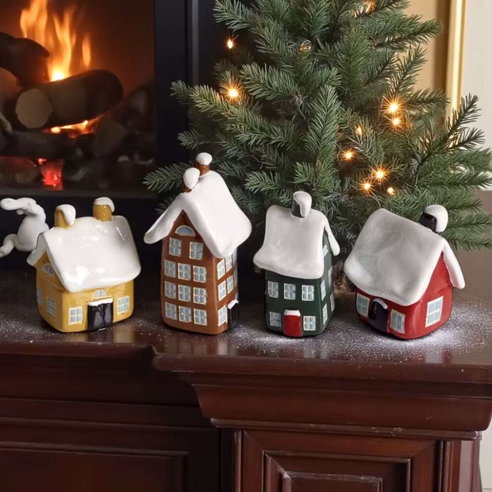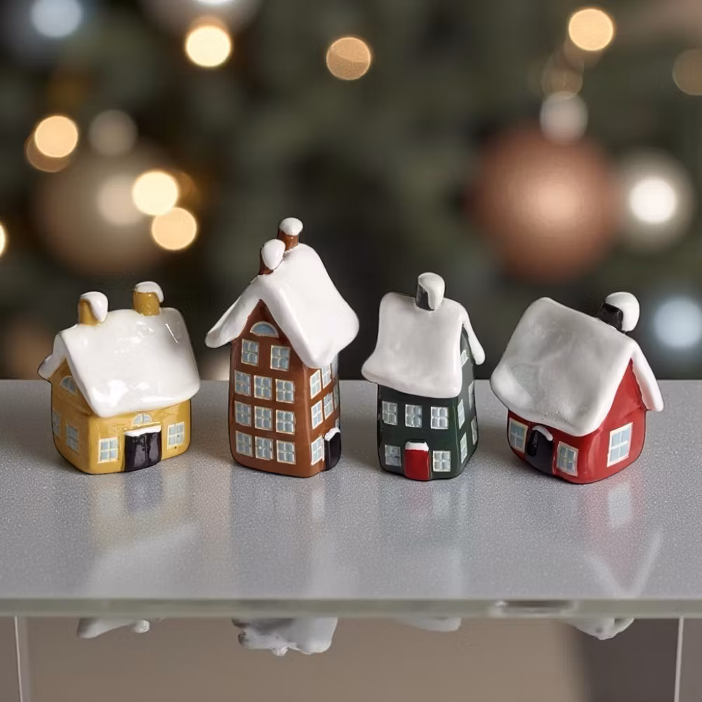 En liten vinterby med fyra charmiga hus i olika färger och former – ett grönt, ett rött, ett gult och ett brunt. Husen är mellan ca 4,5 till 6,5 cm höga, och har varsin karaktär som gör dem till ett levande inslag i din juldekor.