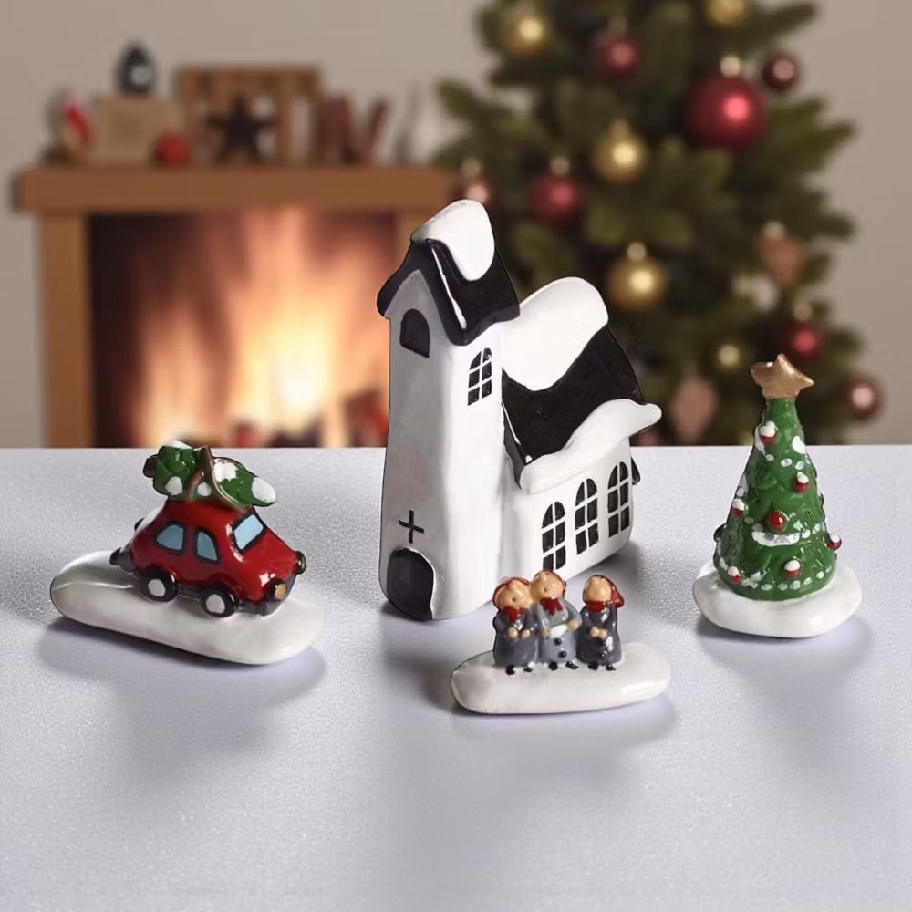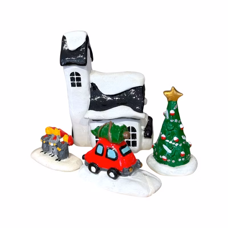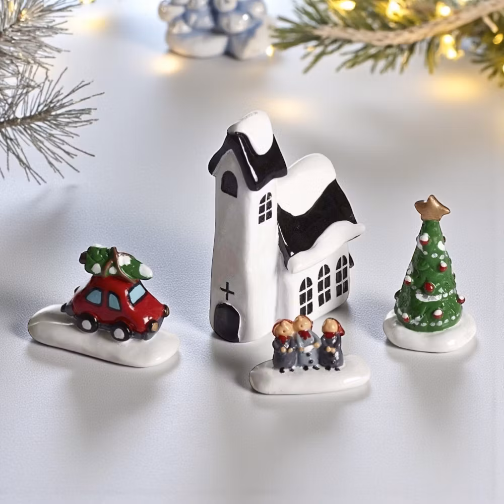 En liten, liten vinterby som rymmer mycket julstämning – med kyrka, julgran, bil och en sjungande julkör. Figurerna är mellan ca 1,5 till 8 cm höga, vilket gör byn nätt och lättplacerad – perfekt för fönsterbrädan, hyllan eller som en del av din juldekor.