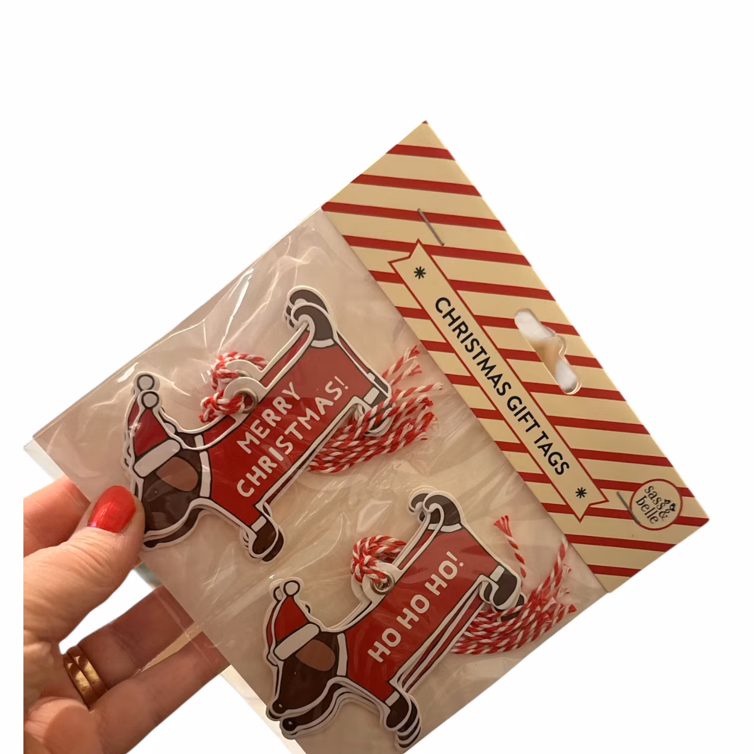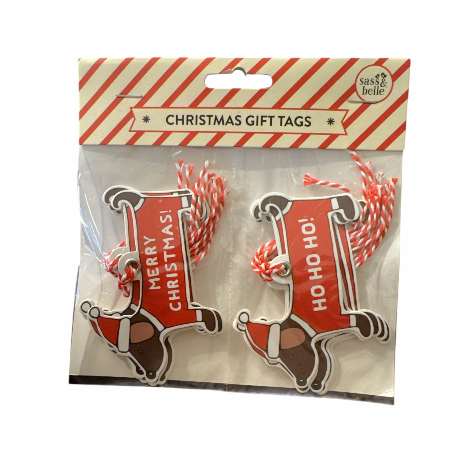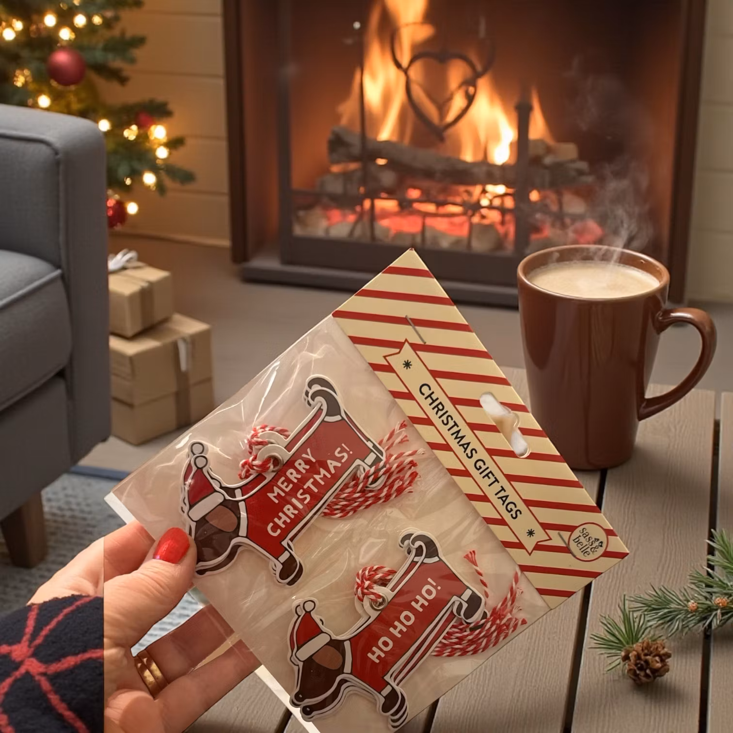 Gör dina julklappar extra personliga och festliga med dessa underbara julklappsetiketter i form av en tax klädd i julkläder, prydd med textenMerry Christmas. Varje förpackning innehåller 12 etiketter som redan är försedda med snöre, vilket gör dem enkla att fästa direkt på paket, chokladaskar eller julblommor. Med en storlek på cirka 9 × 6 cm är de perfekta för både små och stora gåvor, och ger en lekfull och varm känsla till julens paketinslagning. Ett måste för hundälskare och alla som vill sprida lite extra glädje under julen.