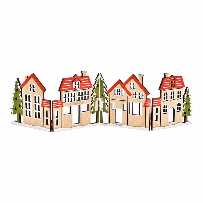 Denna charmiga julkuliss är perfekt för att skapa en magisk atmosfär i ditt hem. Kulissen består av hus och granar i trä som du enkelt fäller ut och använd