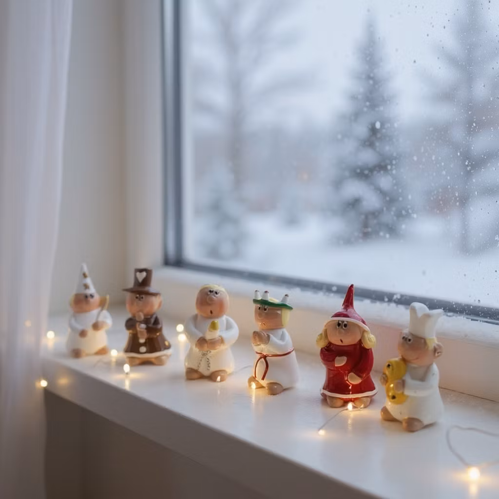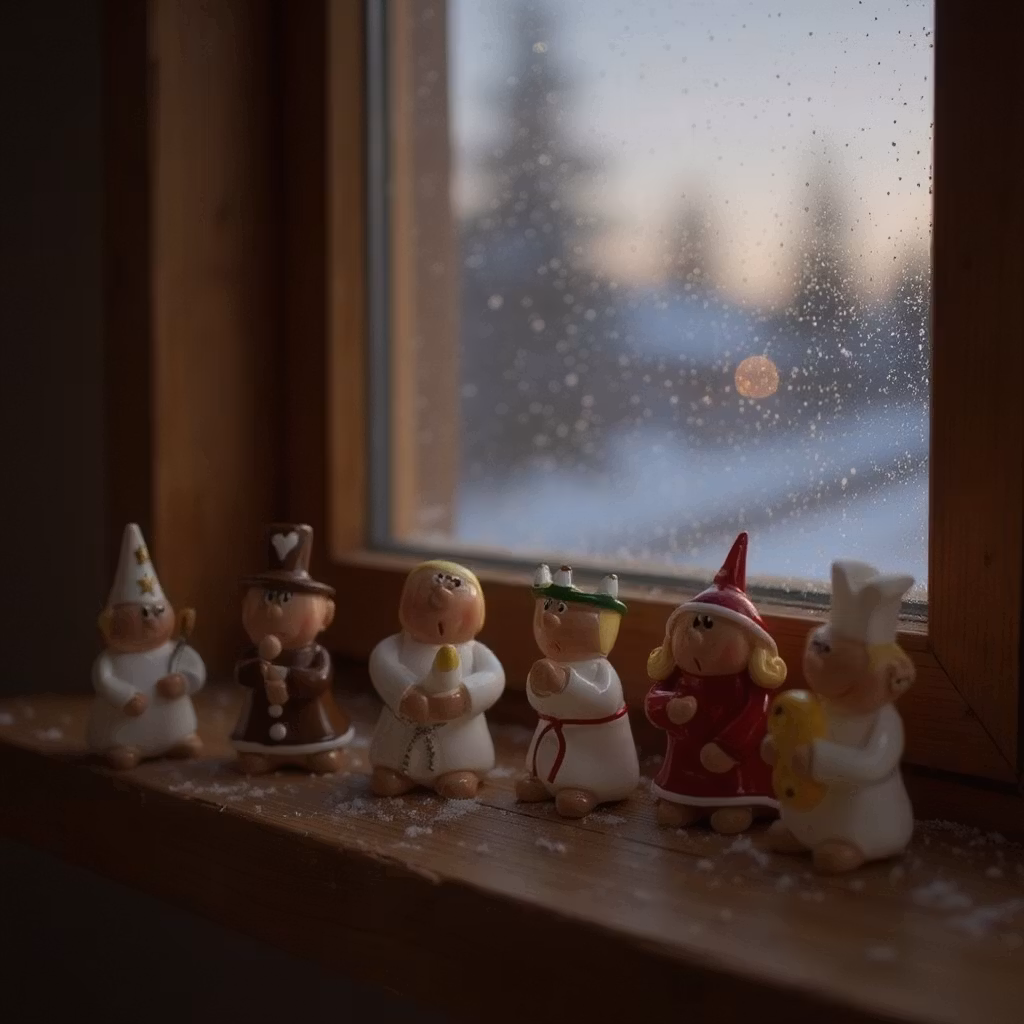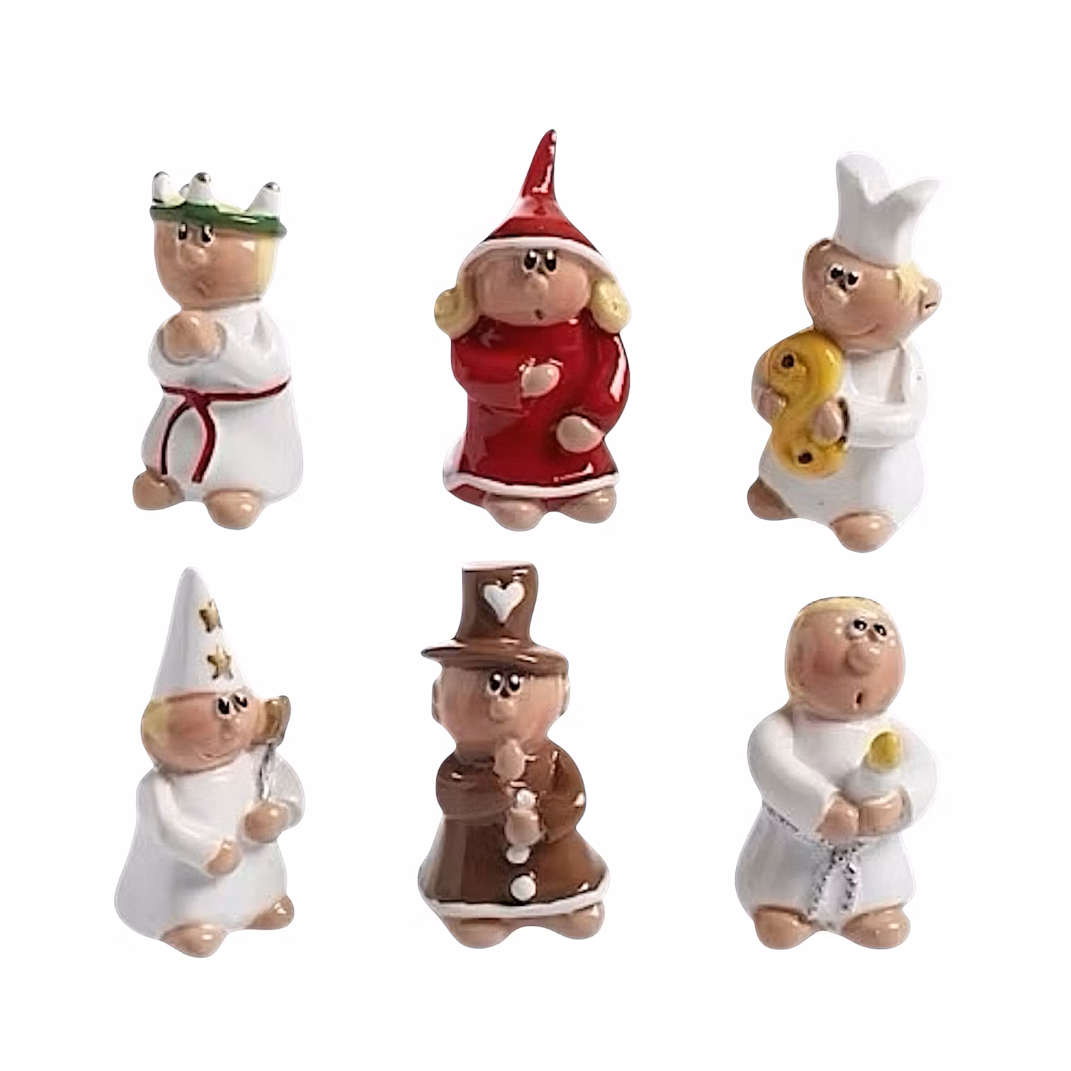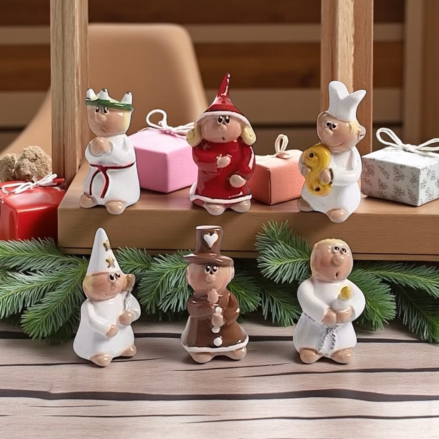 Ett litet luciatåg med stor personlighet – sex figurer som sprider julglädje i miniatyr. Perfekt för små utrymmen eller som samlarobjekt.