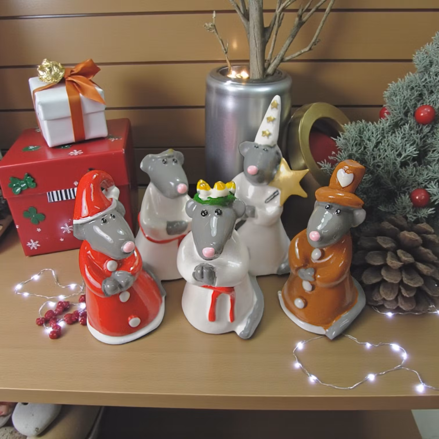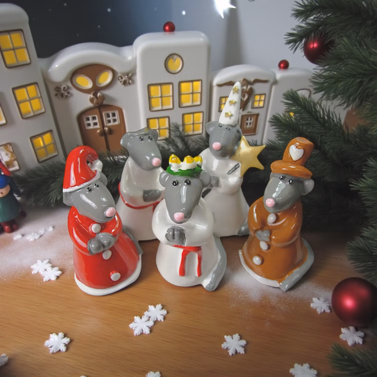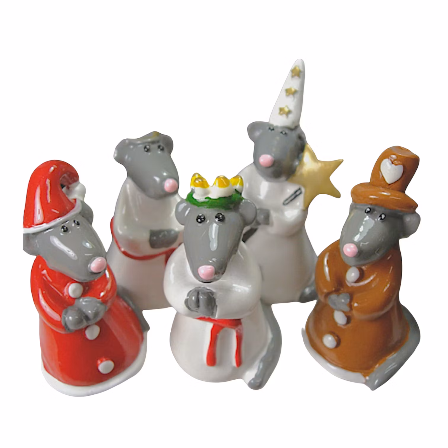 Fem små möss i luciatåg – en lekfull tolkning av julens mest älskade tradition. Ca 3 cm höga, formgivna med glädje och fantasi.