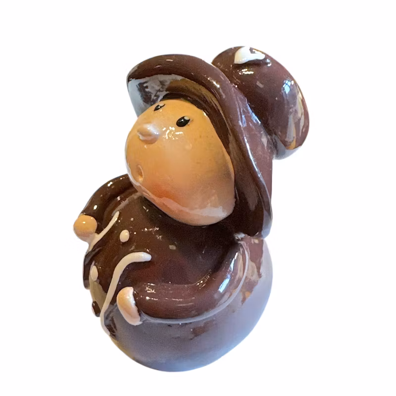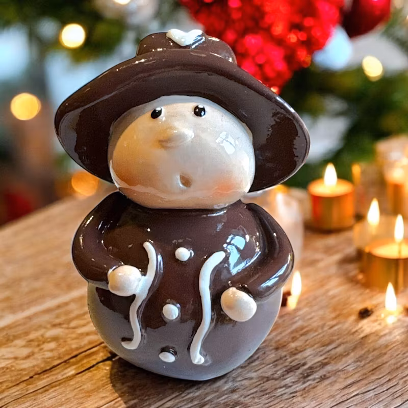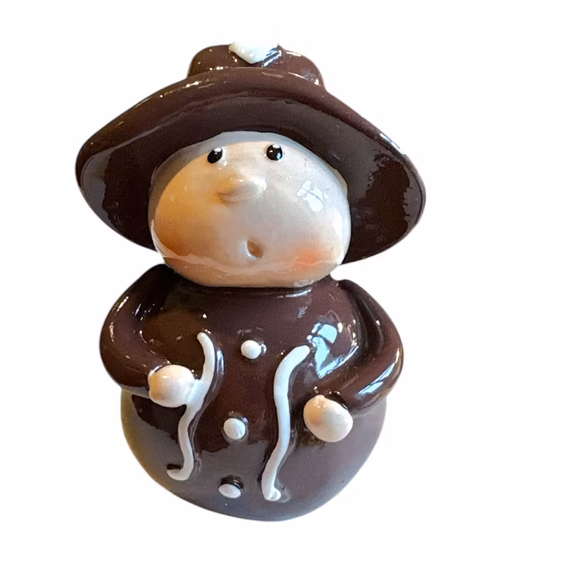 Han bär en hatt och rock dekorerad med vit glasyr,
