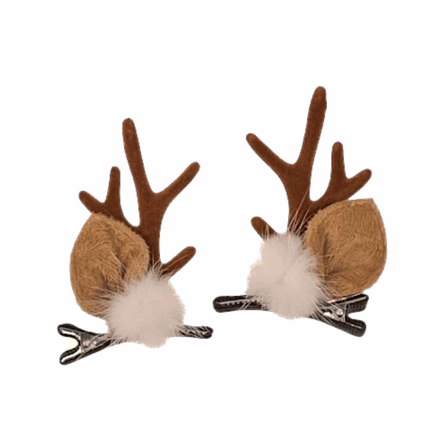 Festliga hårklämmor i svart metall med små renhorn, öron och en vit tuss i plush. Levereras i 2-pack och passar både barn och vuxna med lekfullt sinne.