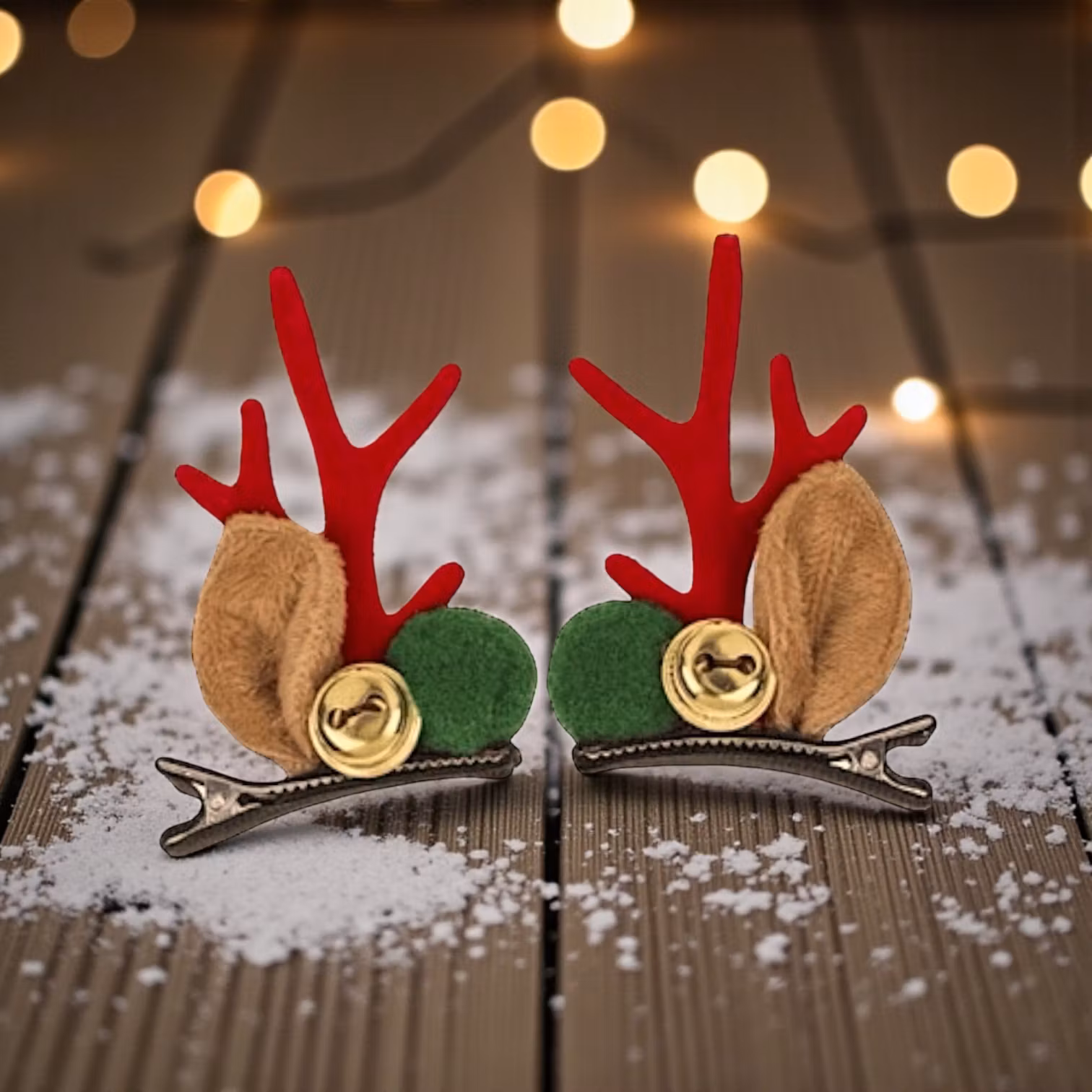 Skapa en festlig frisyr med dessa charmiga hårklämmor i 2-pack. Varje klämma är dekorerad med röda renhorn, små öron, en mjuk grön boll i plush och små bjällror som ger en härlig julkänsla. Klämmorna är tillverkade i svart metall och har en nätt storlek på 4,5 x 7 cm, vilket gör dem enkla att fästa och bekväma att bära.
