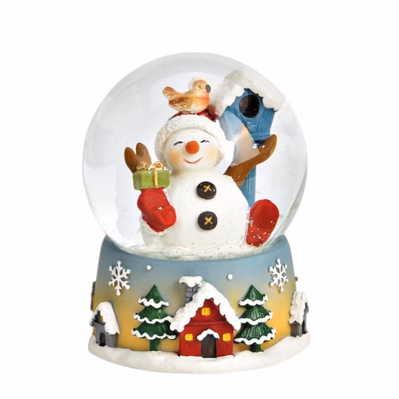 Dekorativ Snöglob med en snögubbe med fågel och fågelholk.