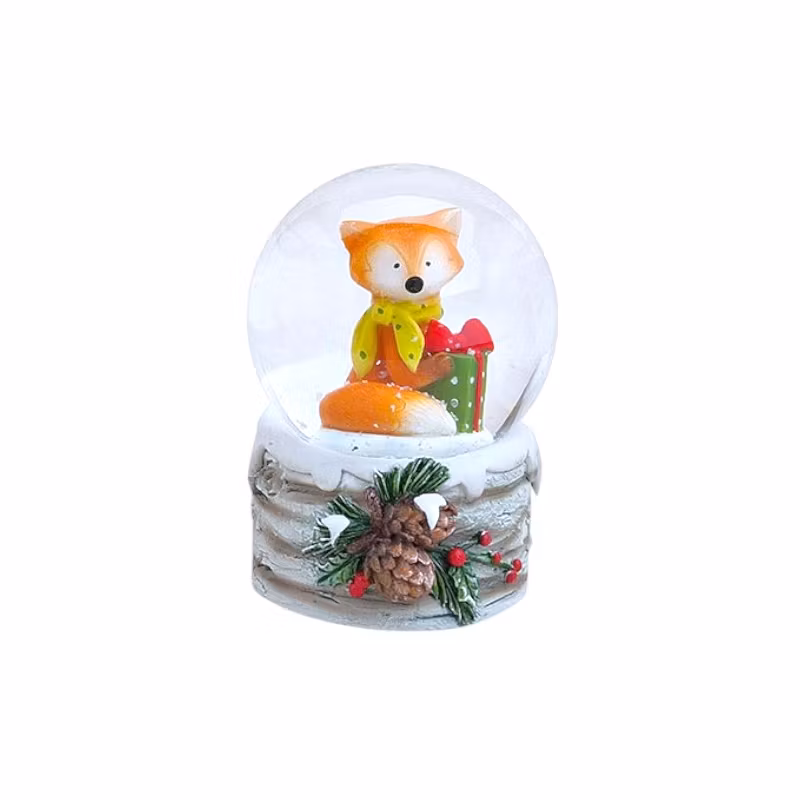 Snöglob i litet format med söt liten räv med paket i gröt och rött.Stl: 4 x 6x 4 cmPris: 85:-Materiel: ployresin, glas