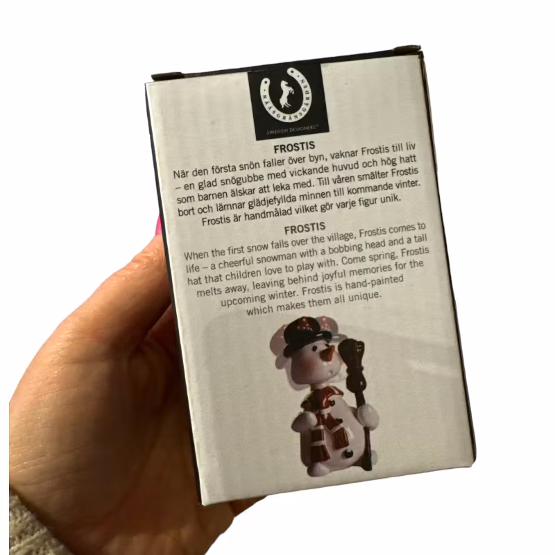 Figuren är ca 10,5 cm hög, tillverkad i polyresin med handmålade detaljer. Designen är min egen, skapad exklusivt för Nääsgränsgården med inspiration från barndomens snöiga dagar och klassiska juldekorationer.
