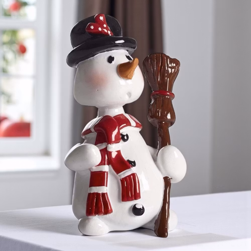 Snögubben Forstis är redo för vinterväder och julmys! Med sin svarta hatt på sned, rödrandiga halsduk och kvasten tryggt under armen står han stadigt – och vickar glatt på huvudet när du rör honom.