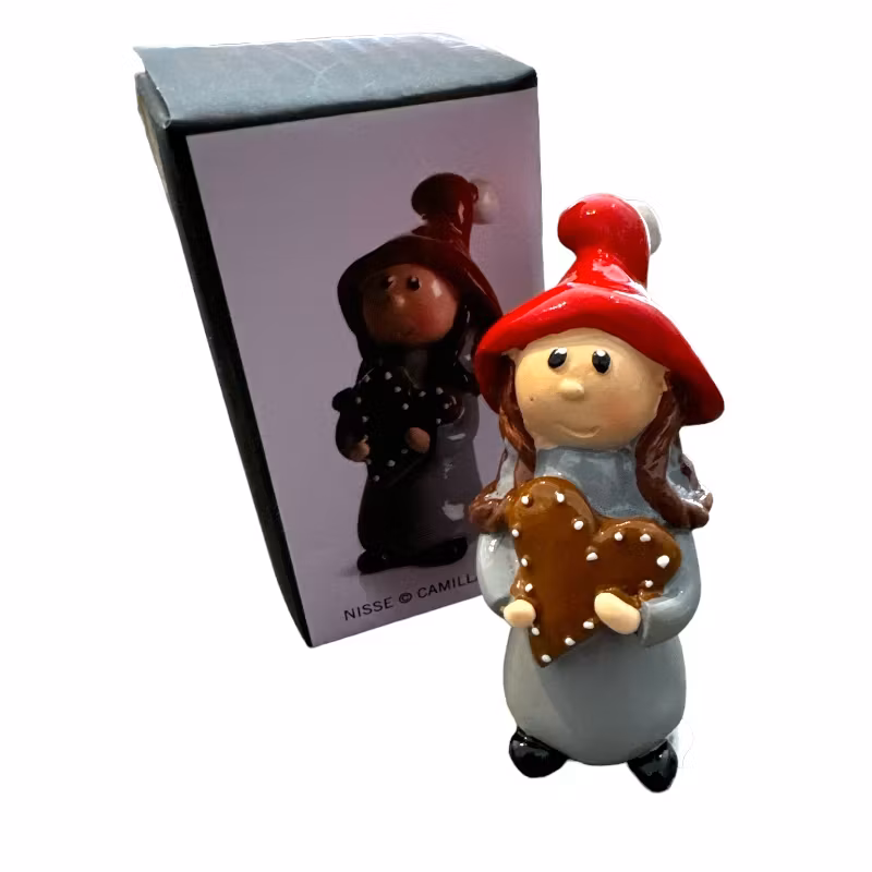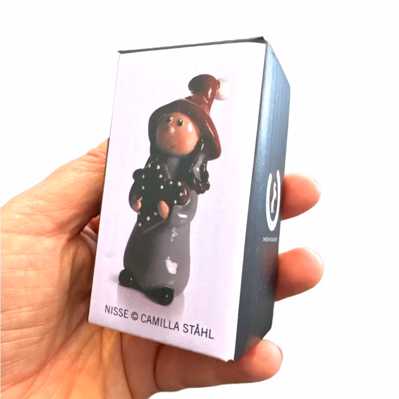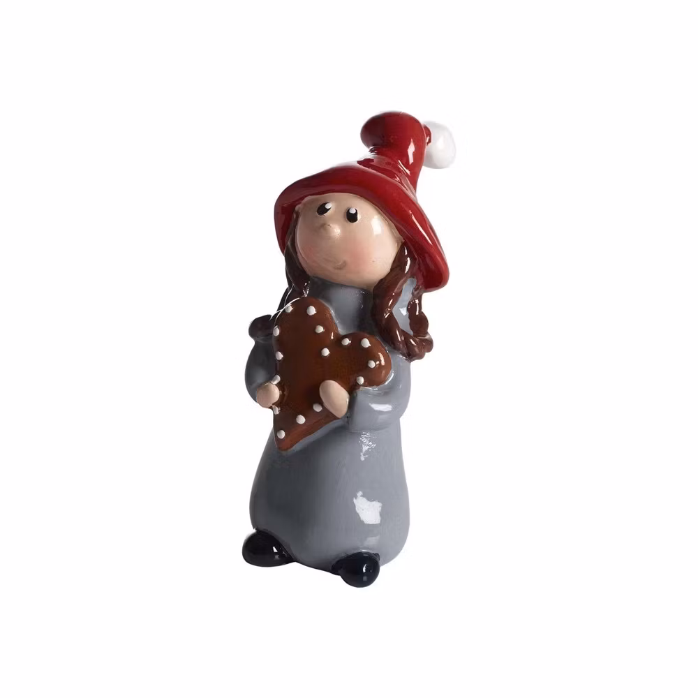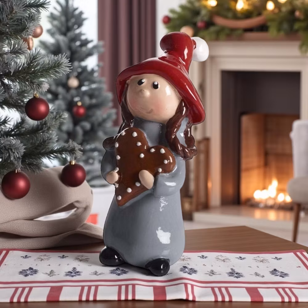 Lilla Lotta är en söt tomteflicka med långt brunt hår och ett stort pepparkakshjärta i famnen. Hon står där med varm blick och julkänsla, redo att sprida stämning var hon än hamnar. Med sin nätta storlek får hon plats lite här och där – på hyllan, i fönstret, bland juldekorationerna eller som en liten överraskning till någon du tycker om.