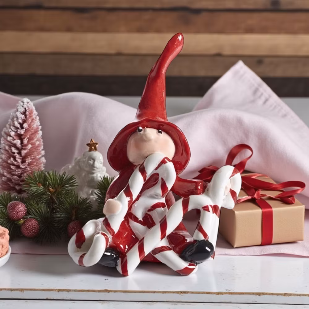 Den här lilla tomtenissen är klädd i rött från topp till tå och har hamnat mitt i ett sött juläventyr – omgiven av klassiska polkagrisar i rött och vitt. Med ett glatt uttryck och en lekfull känsla sprider han både färg och fest i vintermörkret.