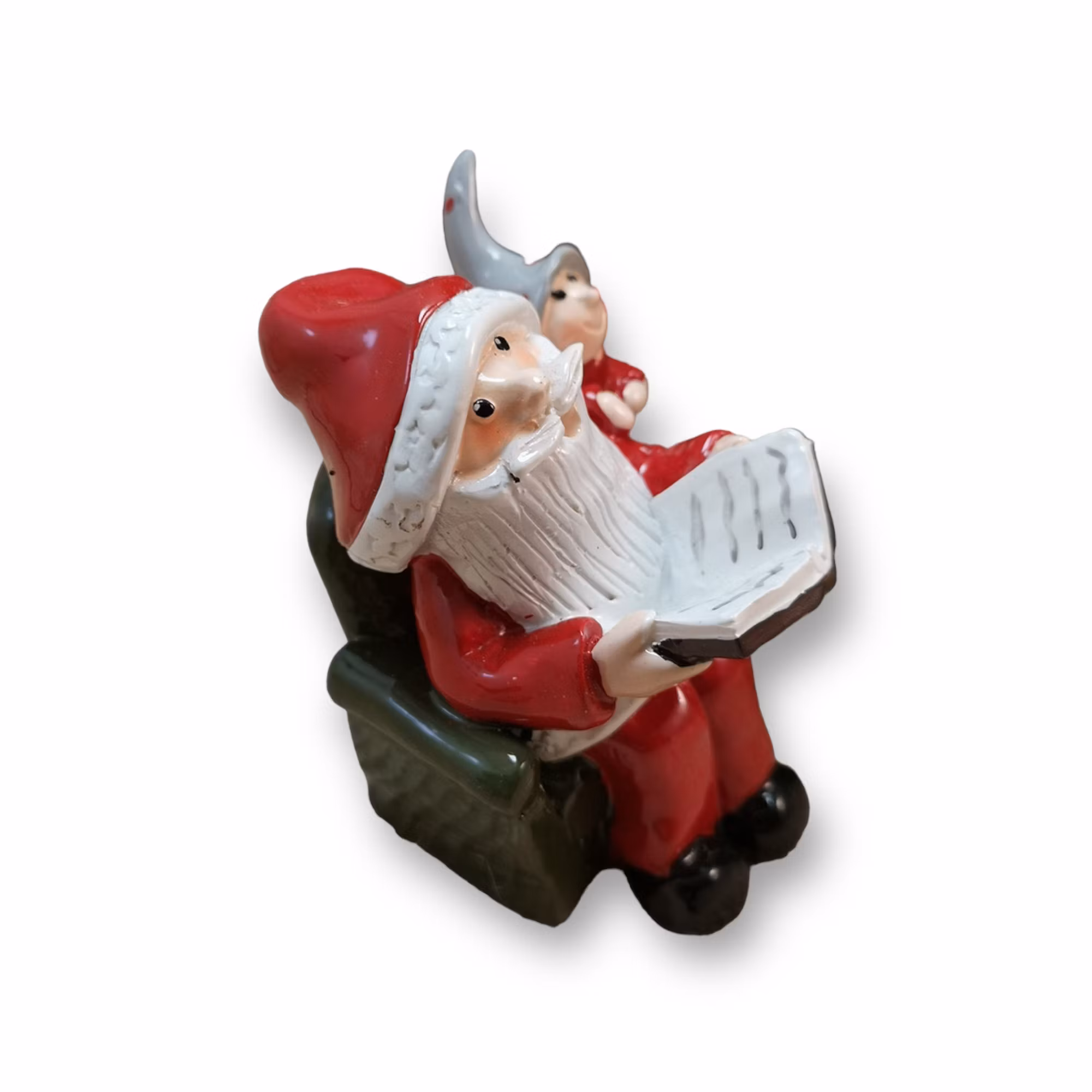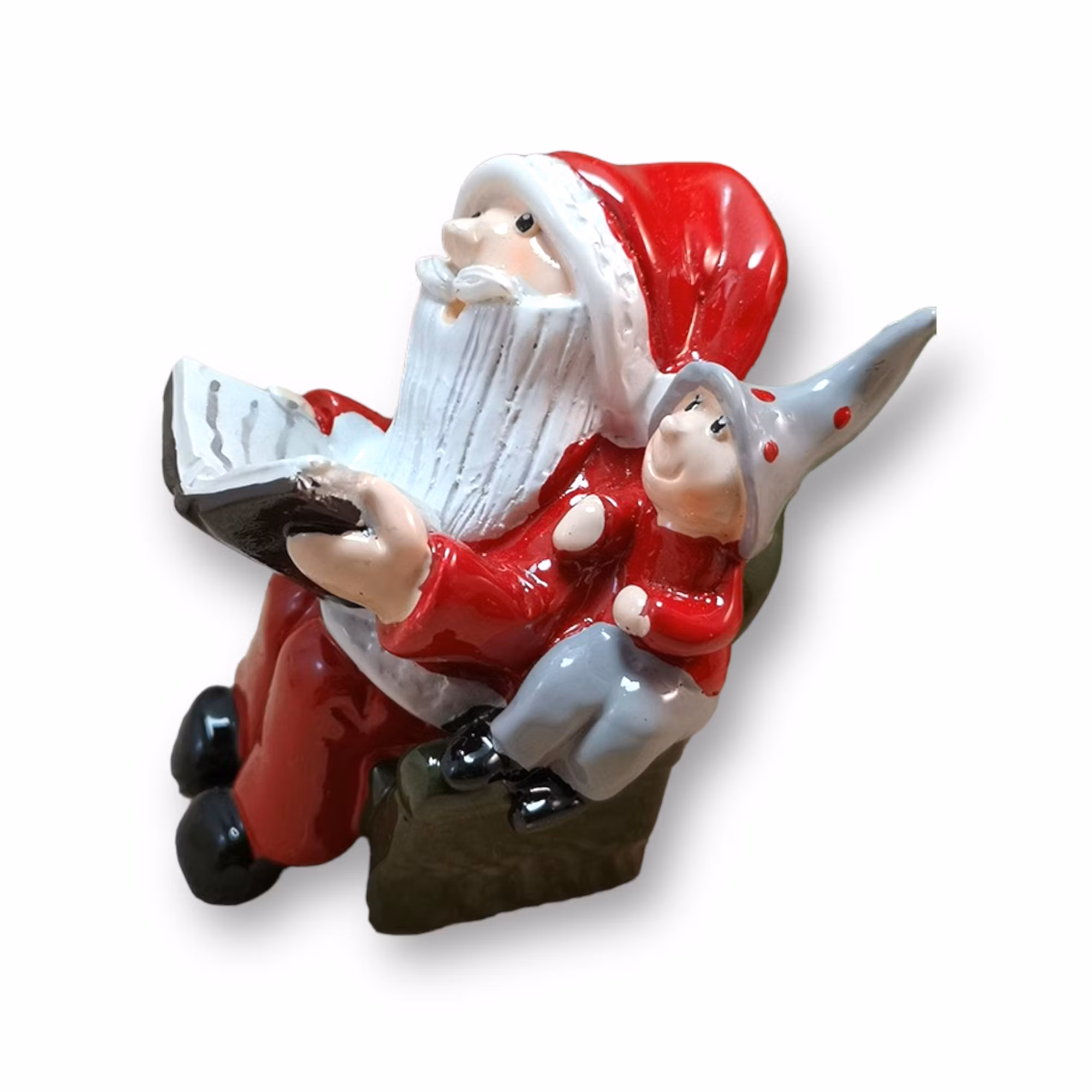 Här sitter tomten och läser högt för tomtenissen.EGEN DESIGNStl: 5 x 6 x 8 cmPris: 149:-