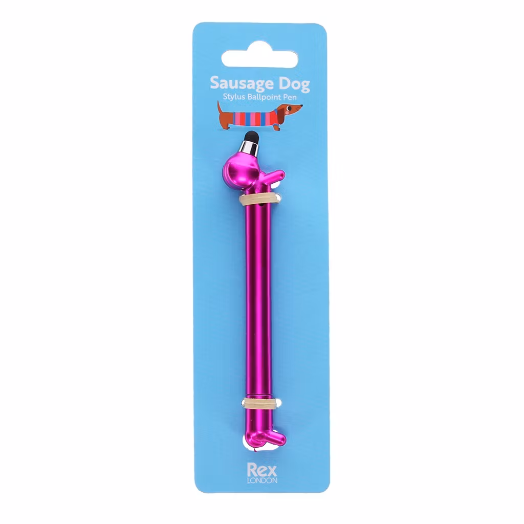 Söt taxformad kulspetspenna i rosa med blått bläck. Perfekt för hundälskare! Stylus-funktion för smartphone och surfplatta.
