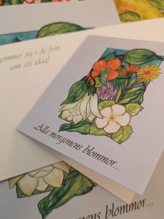 Kort i fem olika motiv och citat om trädgård.Stl: 10,5 x 10 cm inkl kuvertPris: 19:-