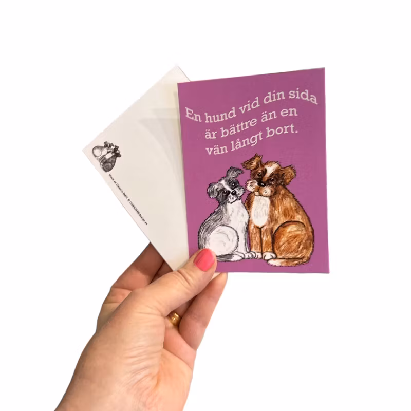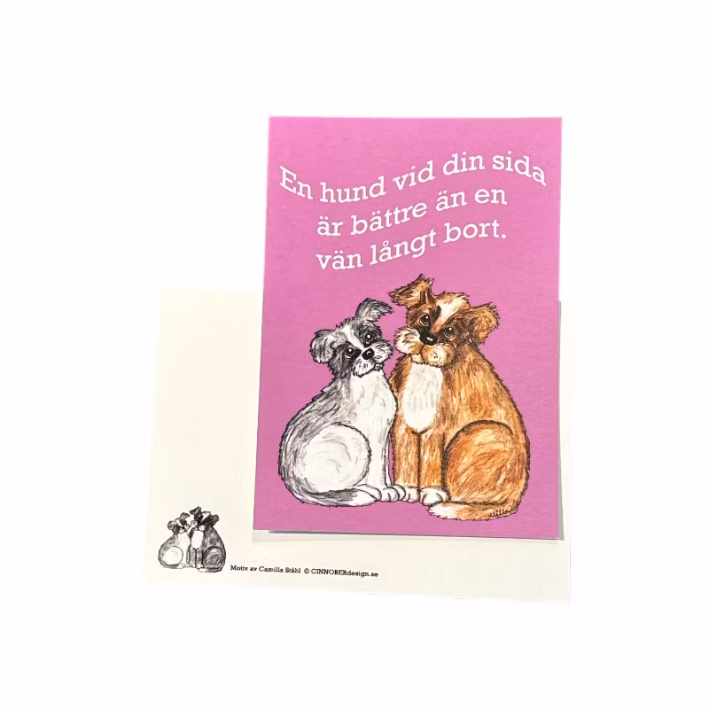 Färgglatt kort med hundar och citat!Tryckta på kraftigt papper och med fin glans, slät baksida för text.Stl: 13 x 9 cmPris 8:-/st