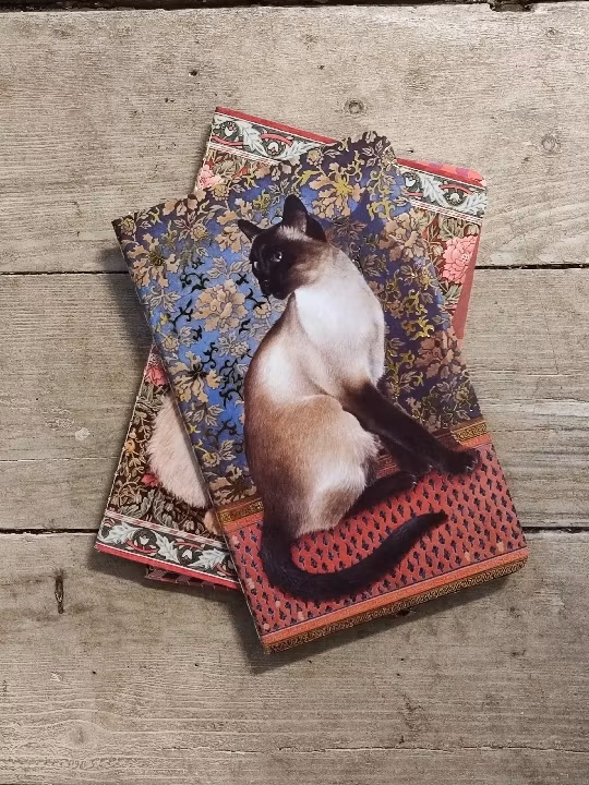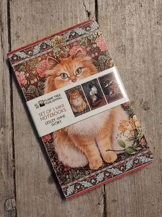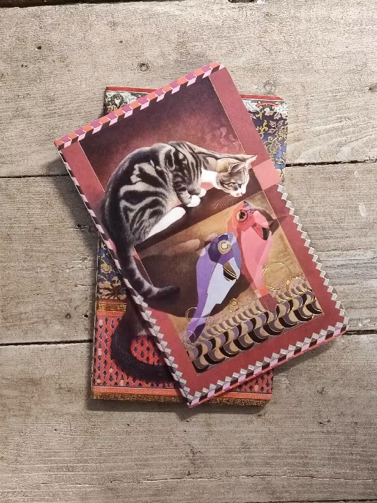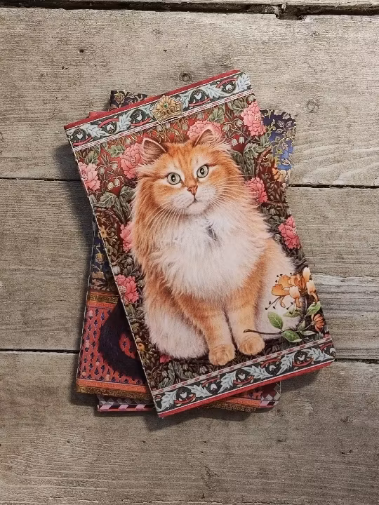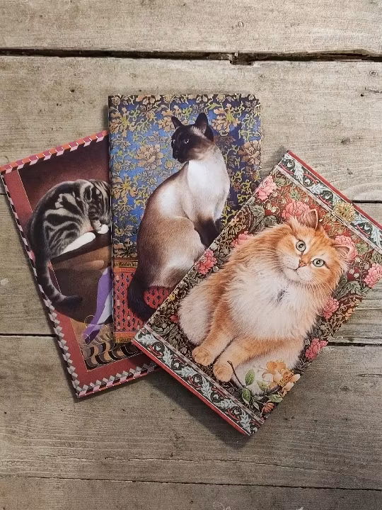 Tre små anteckningsböcker i tre olika motiv med rundade hört och sydd rygg.