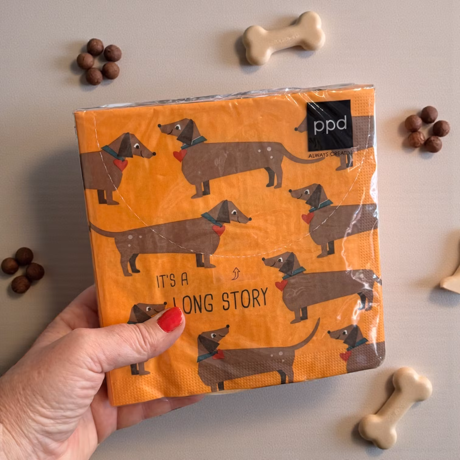 Lekfulla lunchservetter med taxar på orange botten, halsband med rött hjärta och texten It’s a long story.