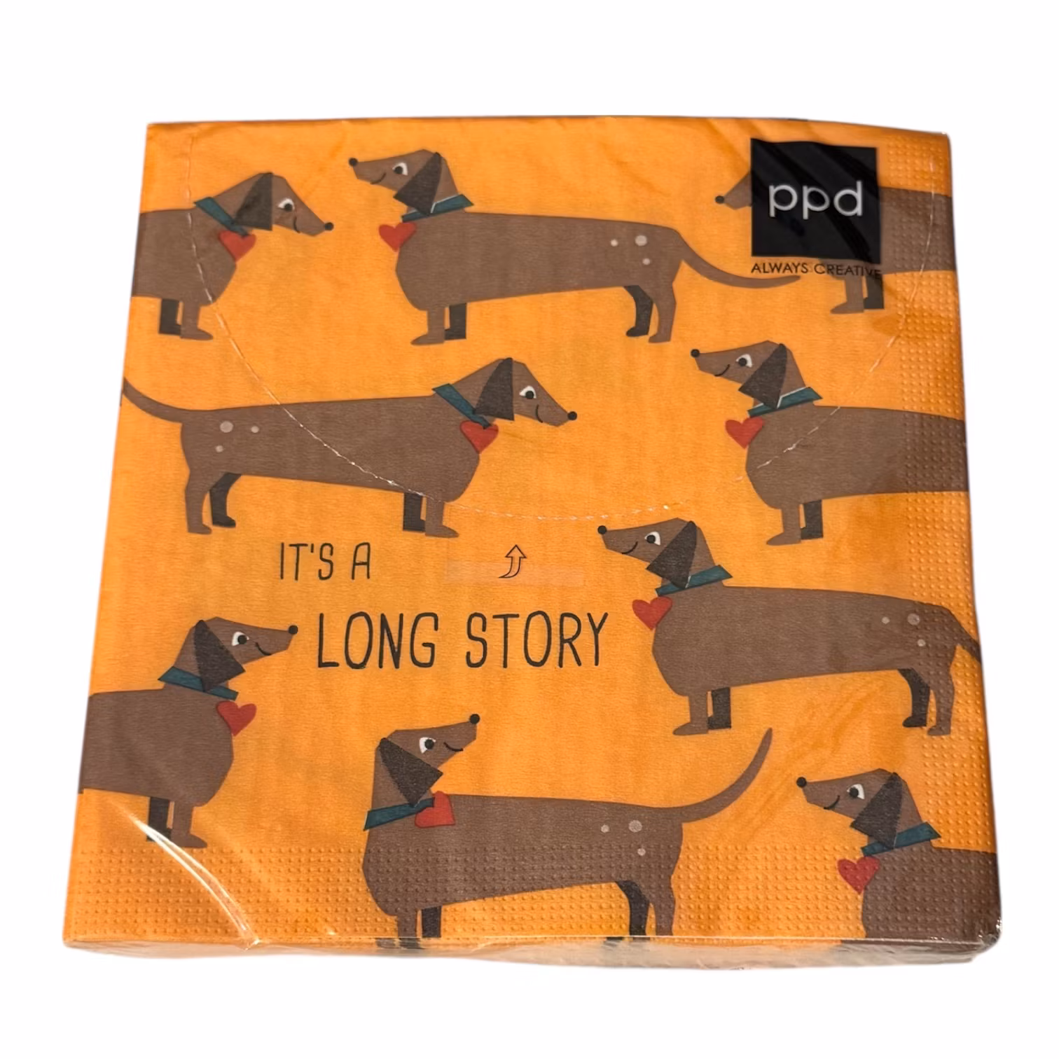 Ge din dukning en unik och humoristisk touch med dessa lunchservetter med hundmotiv. Motivet visar flera taxar med halsband och röda hjärtan runt halsen, placerade mot en varm orange botten. Servetterna pryds dessutom av den charmiga texten It’s a long story, vilket gör dem till en rolig detalj som garanterat väcker leenden.