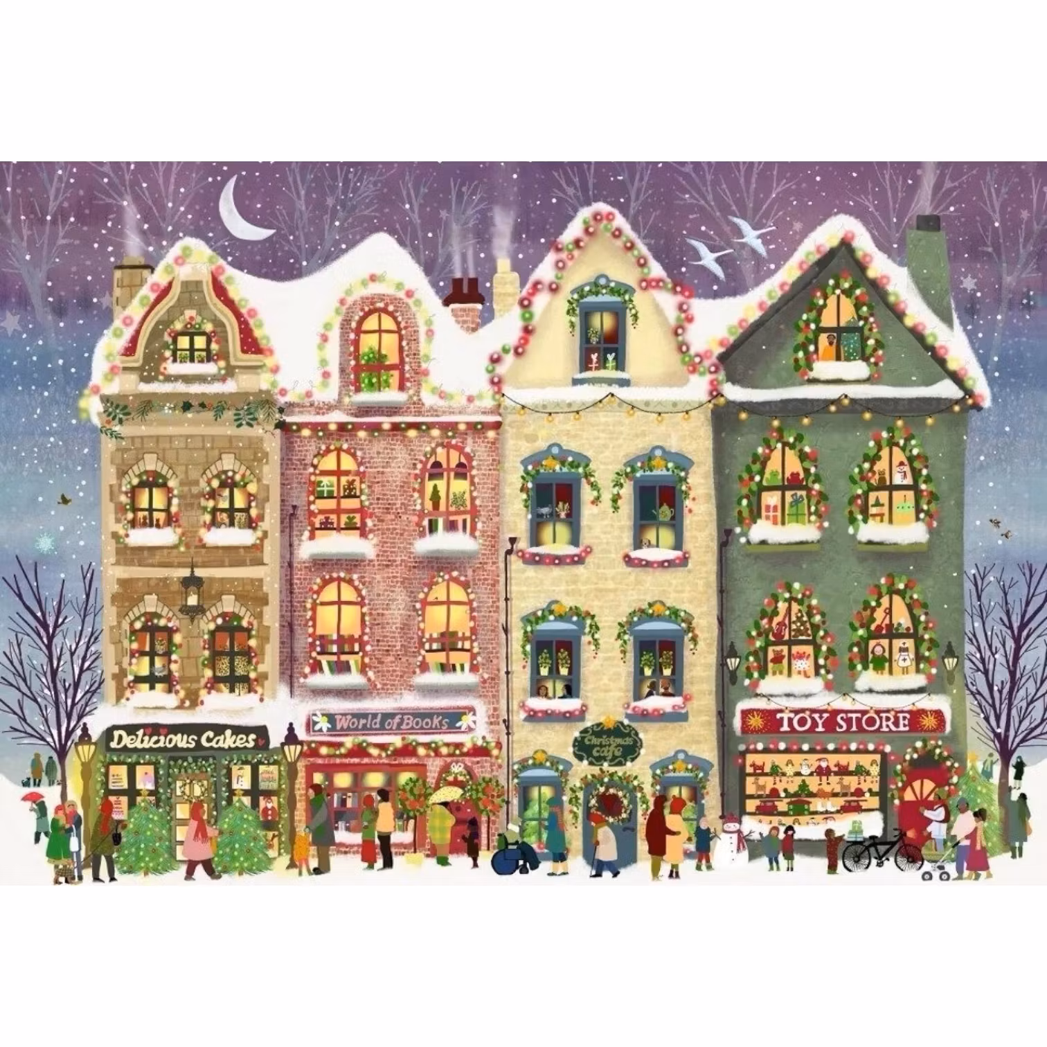 Det är sen kväll i stan, snön faller stilla och julhandeln är i full gång. I detta charmiga pussel ser du fasaderna av fyra höga hus, snöklädda och vackert upplysta, med butiker på bottenvåningen och människor som rör sig längs gatan. Motivet är tecknat med tydliga konturer och fullmatat med detaljer – skyltfönster, juldekorationer, glada ansikten och vinterstämning. Med 1000 bitar och en färdig storlek på 69 x 48 cm är det ett perfekt pussel för dig som älskar stadens puls i juletid.
