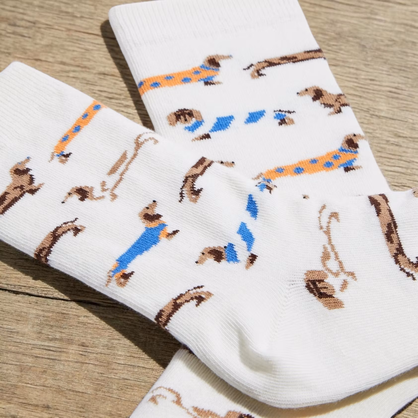 Mjuka och luftiga vita strumpor i 100% ekologisk bomull, dekorerade med färgglada taxar som ger en lekfull och personlig detalj till vardagen.
