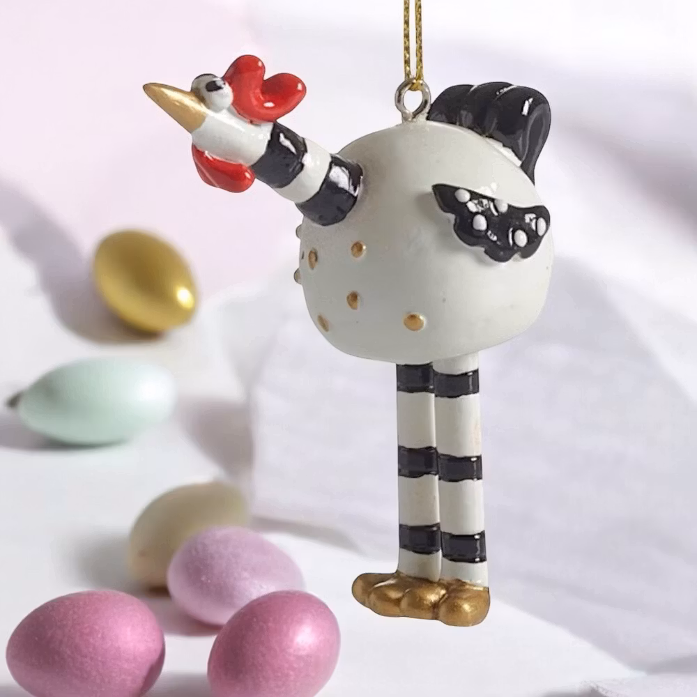 Möt Gyllenkrok, min charmiga höna som hänger och dinglar med sina randiga ben. Perfekt för att dekorera påskriset och sprida glädje i ditt hem.MIN DESIGN f