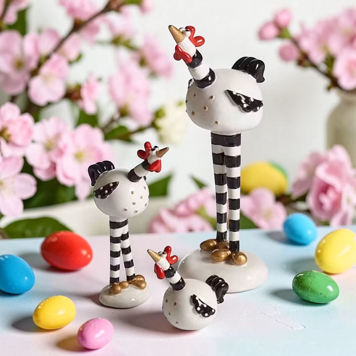 Gyllenkrok‑seriens 3‑pack är ett färgstarkt och uttrycksfullt set påsktuppar designat av mig, Camilla Ståhl, för Nääsgränsgården, skapat för att ge ditt hem en lekfull, varm och personlig påskstämning. Varje tupp har vit kropp som kompletteras av detaljer i svart och rött som ger figurerna ett charmigt och livfullt uttryck, medan näbb och fötter i guld tillför en tydlig och karaktärsfull kontrast. Trion tripp, trapp och trull är formgivna i storlekarna 17, 12 och 6 cm och är skapade för att harmoniera både tillsammans och var för sig, vilket gör dem perfekta att placera på matbordet, i fönstret eller som en färgklick i vilket rum som helst. Med sin unika design, sina glada färger och sin tidlösa form blir detta 3‑pack snabbt en favorit i påskdekorationerna och ett uppskattat inslag år efter år, både som gåva och som något fint att unna sig själv. Dessa kan även köpas styckevis då till ordinarie pris.
