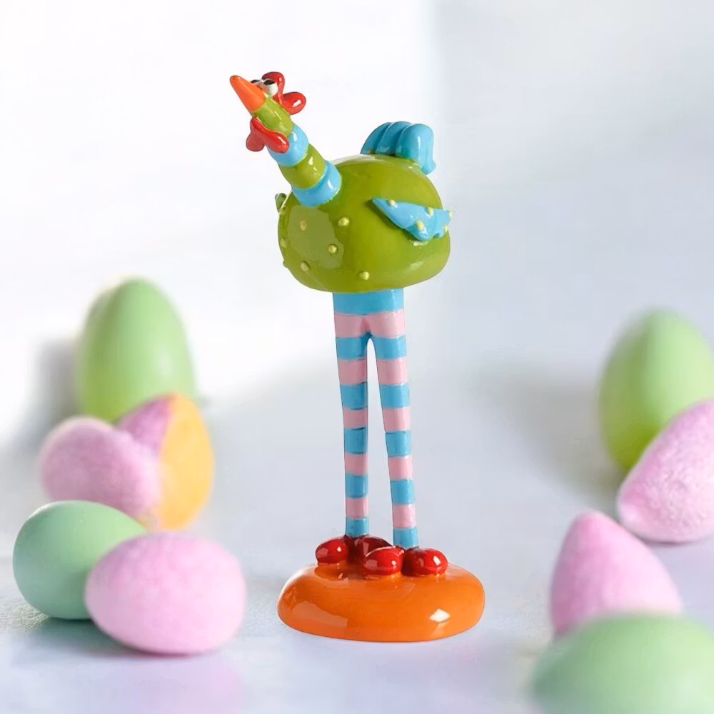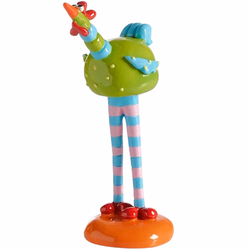 Möt Gyllenkrok, vår charmiga höna med långa randiga ben i större modell. Med en fjäder fäst mellan kroppen och benen, gungar hönan lätt och skapar en lekfull at