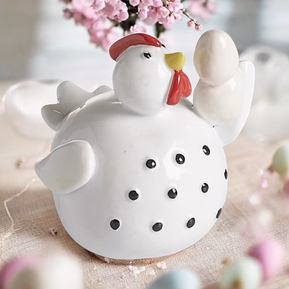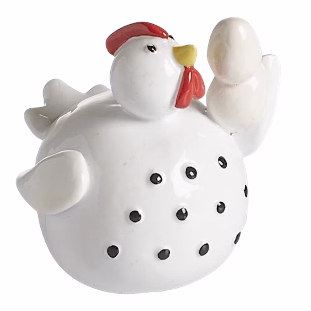 Med prickar på magen och en lekfull design, sprider denna höna glädje och påskstämning i ditt hem. Designad av mig för Nääsgränsgården och levereras i en fin pr