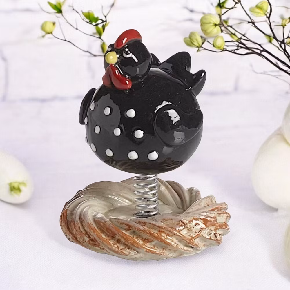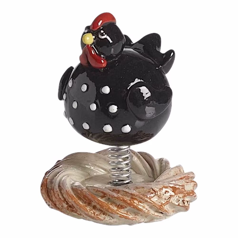 Denna hönan svävar en liten bit över sitt rede tack vare en fjäder i rumpan.Den har även charmiga prickar på magen som ger en lekfull känsla. Designad av mig fö