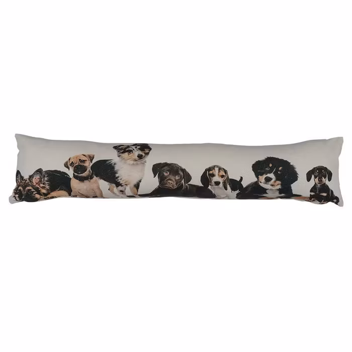 Prydnadskudde med små hundvalpar på. Avlång och passar lika bra som skydd för drag som prydnadskudde.
