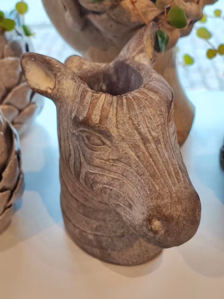 Fin kruka i form av ett zebrahuvud i betong. Passar lika bra inne som ute!