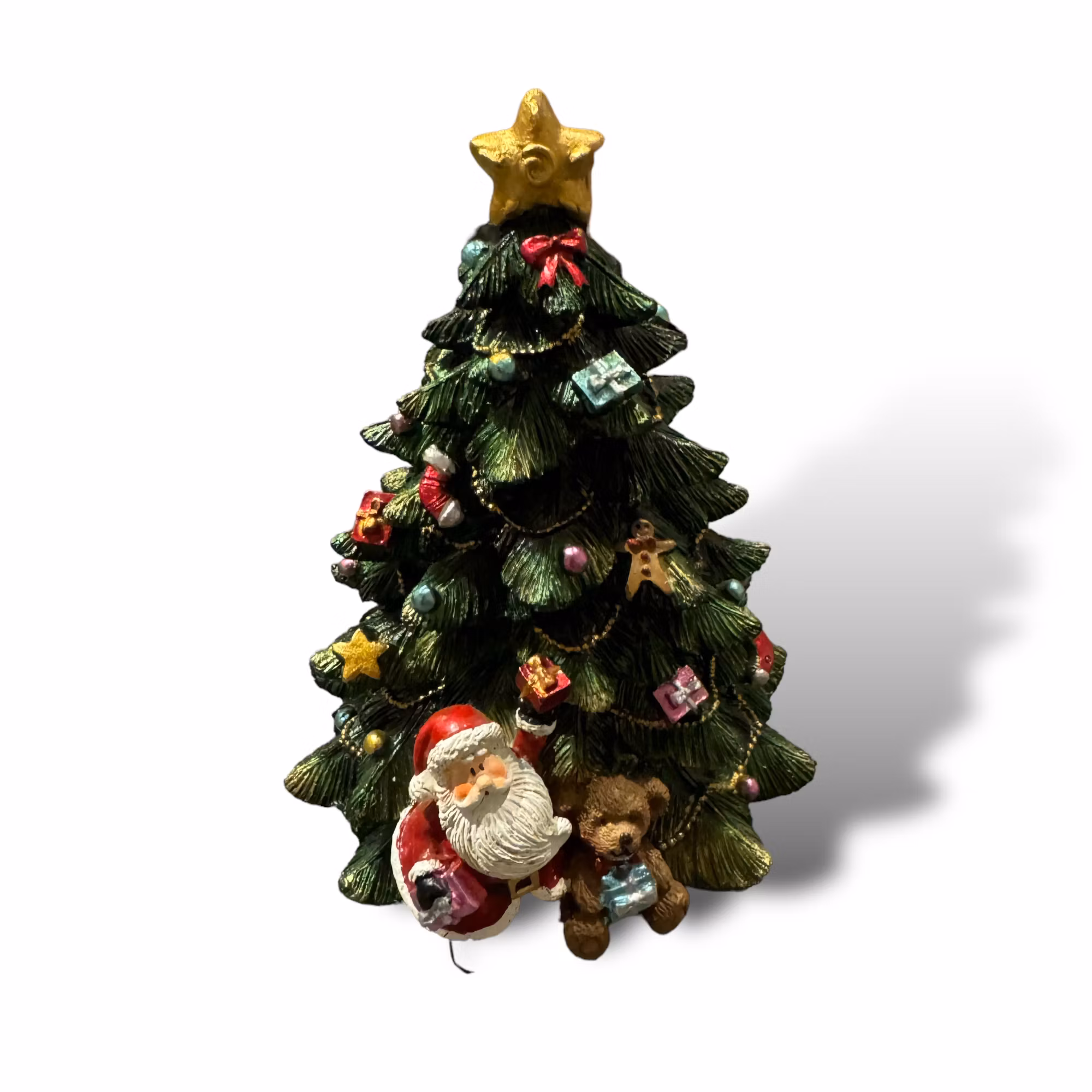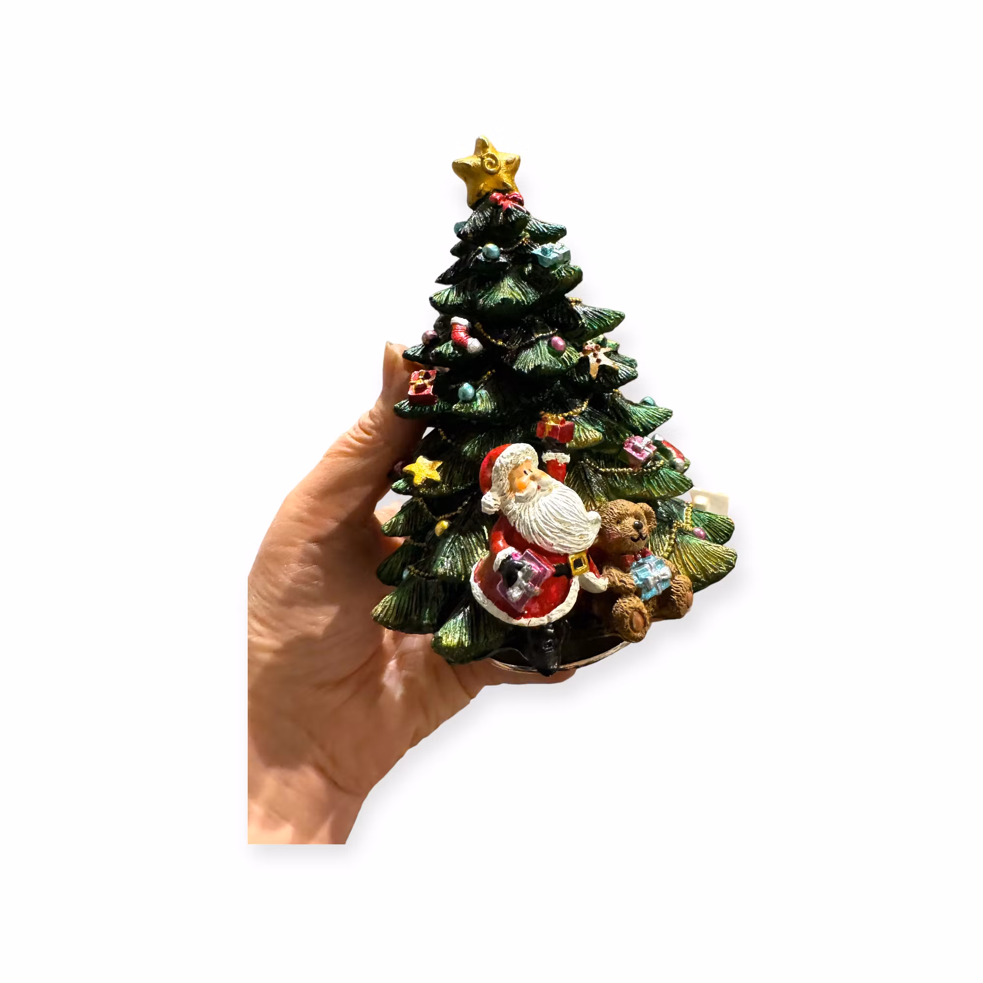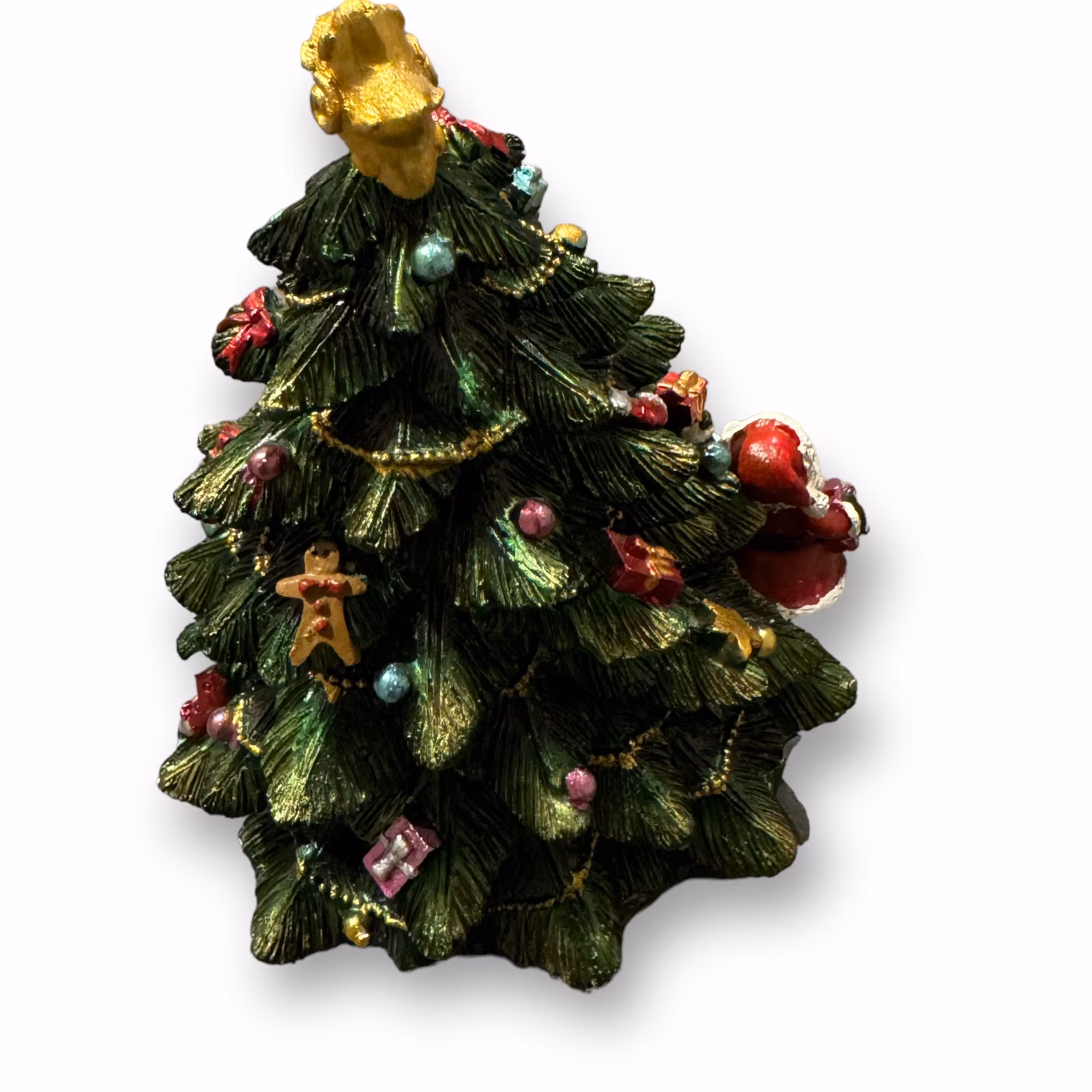 Speldosa som spelar " I wish you a merry christmas" I form av en rikt dekorerad gran.